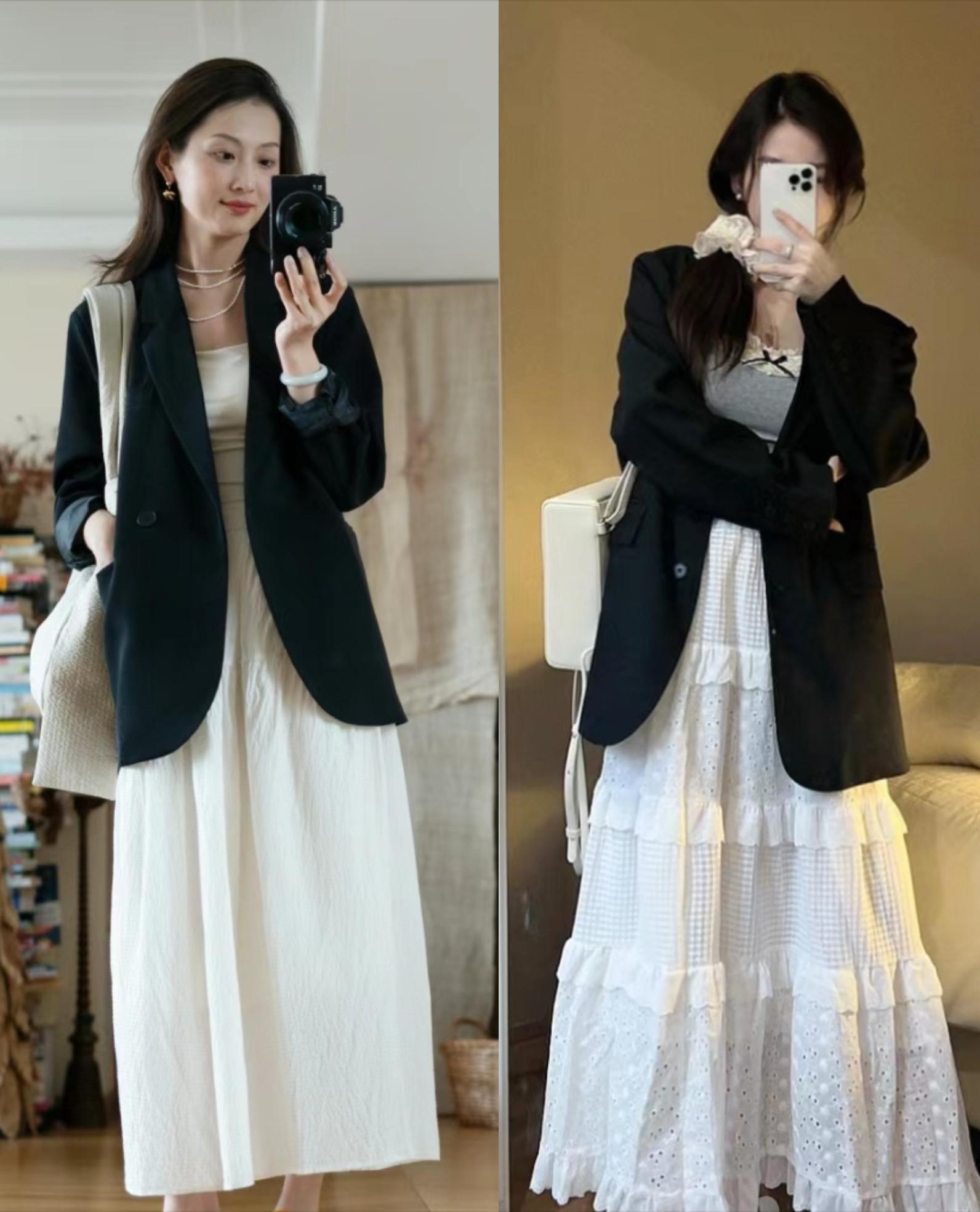 用黑色西服來搭配白色半身裙,經典的黑白配擁有更高級時尚的美。像這種黑色西服,搭配高腰的白色半身裙,溫柔雅緻、又經典耐看。