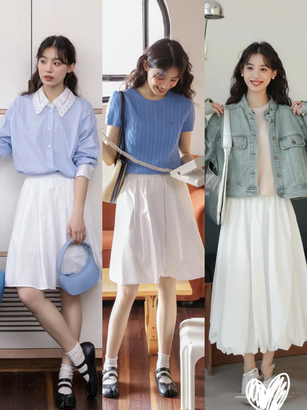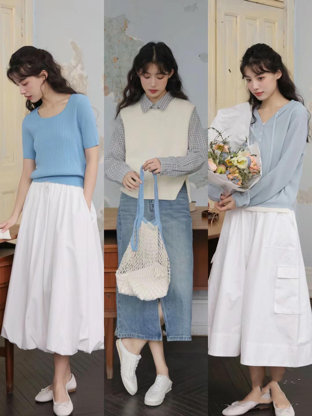 全身顏色數量控制在三種以內,就是簡單且大方的搭配方式。比如白襯衫+黑色馬甲+牛仔半身裙的組合,就清冷文藝。牛仔半身裙直筒的款式、配小白鞋也彰顯青春活力。