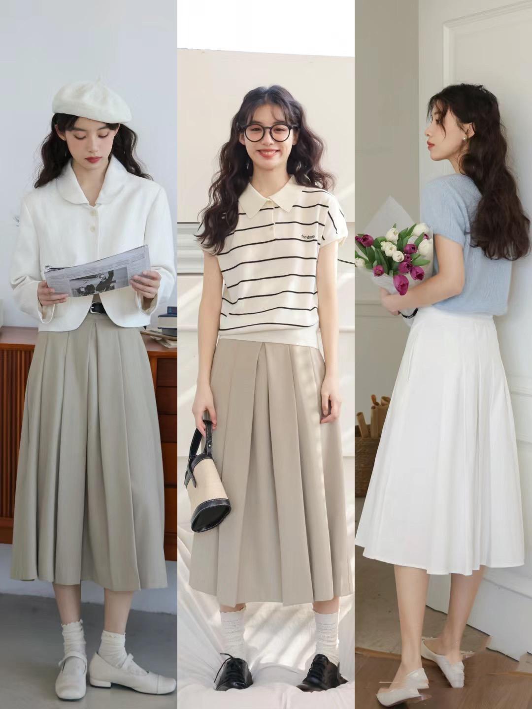淺色系上衣,上身溫柔又顯白,也是春日裏不可少的單品。比如白色的短外套,條紋T恤,都可以搭配高腰的百褶半身裙來穿着。百褶半身裙大量感的裙襬、更多了春日的浪漫風采。