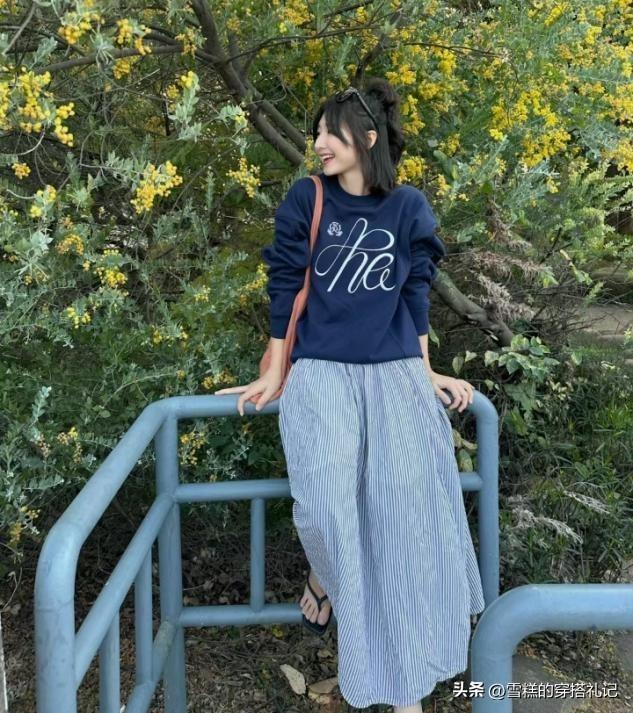 再有一個就是短款衛衣的設計,整體來說下襬部分是不會遮住自己臀部的,那麼更方便,我們去平衡單件褲裝或者長款裙裝的穿法,能夠拉扯出你身材的縱向延伸曲線,不會暴露你的身高短板。