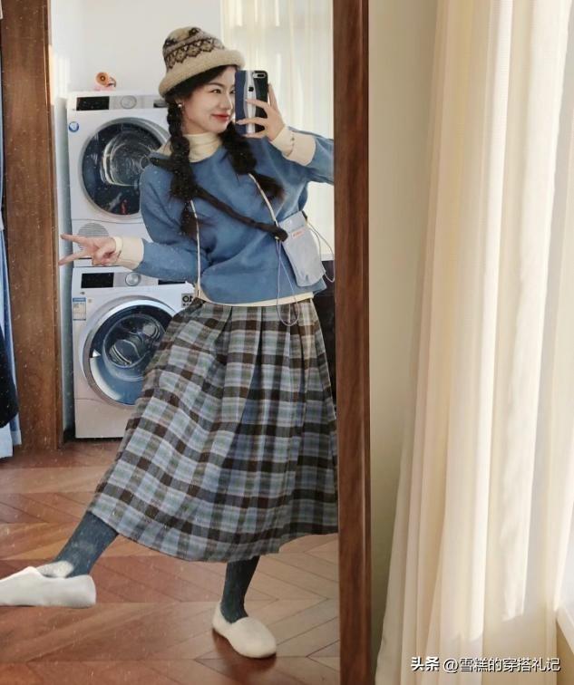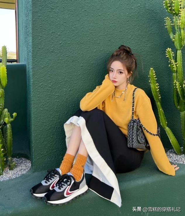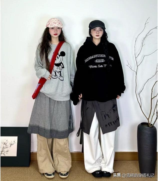 融入長裙和長褲的穿搭不一定要分開來穿,可以嘗試像圖中這種長褲加長裙的着裝效果,上衣的衛衣兩層疊穿,褲子和裙子也兩層呼應,視覺精緻感一樣加分。
