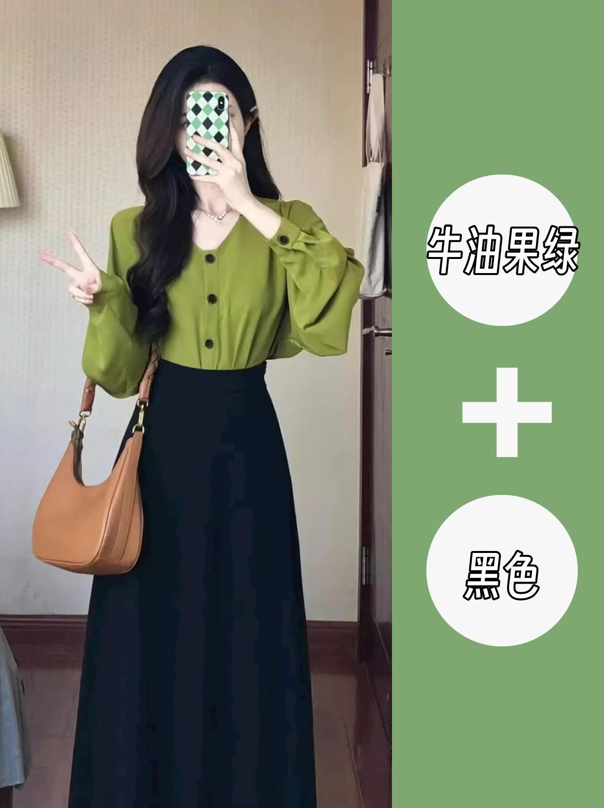 穿搭7:牛油果綠襯衫+黑色傘裙