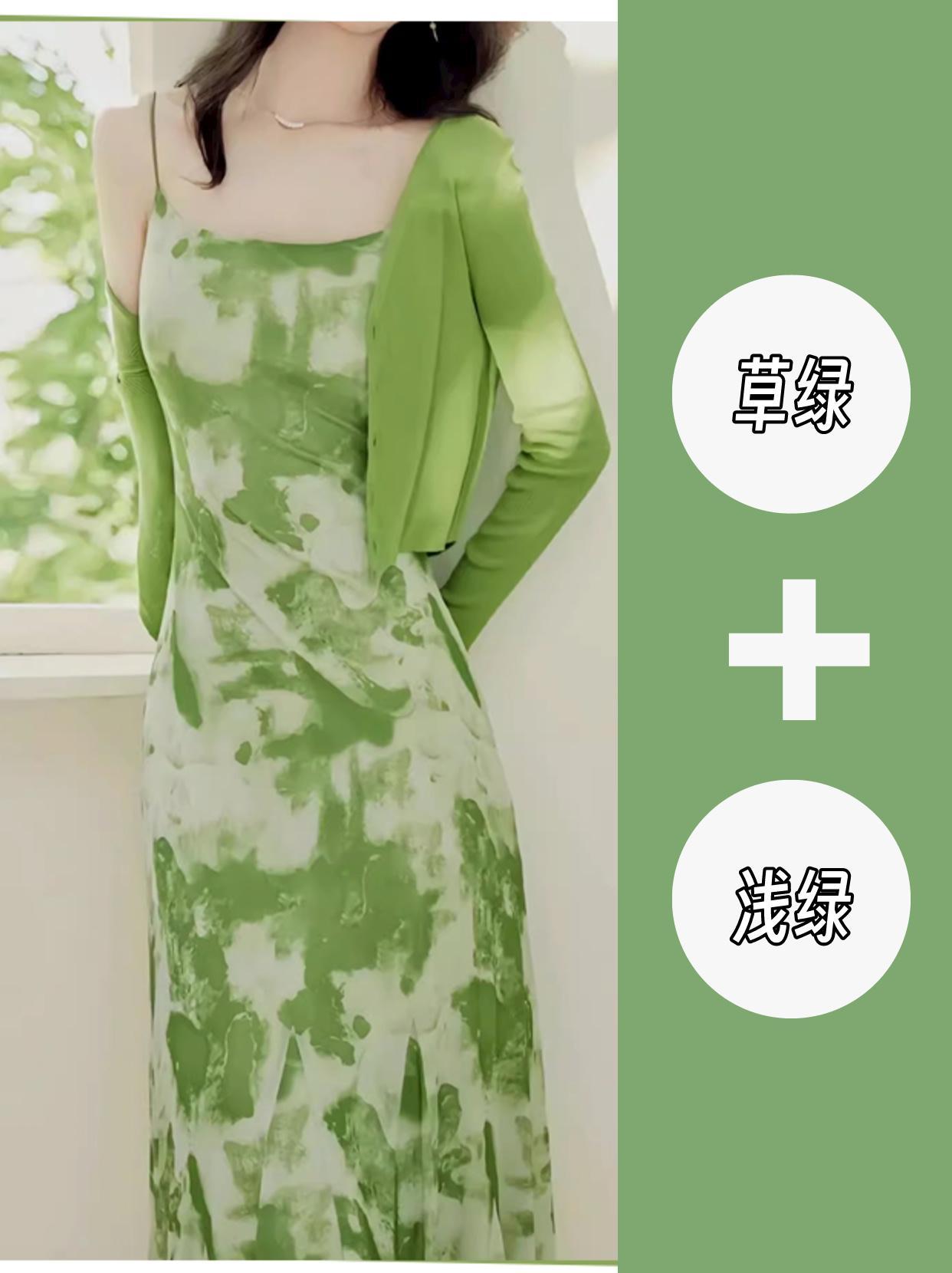 穿搭1:草綠針織上衣+淺綠印花吊帶裙