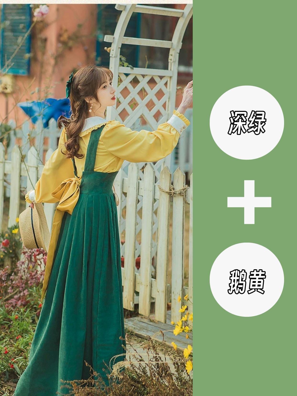 穿搭9:鵝黃甜美風襯衫+深綠吊帶長裙