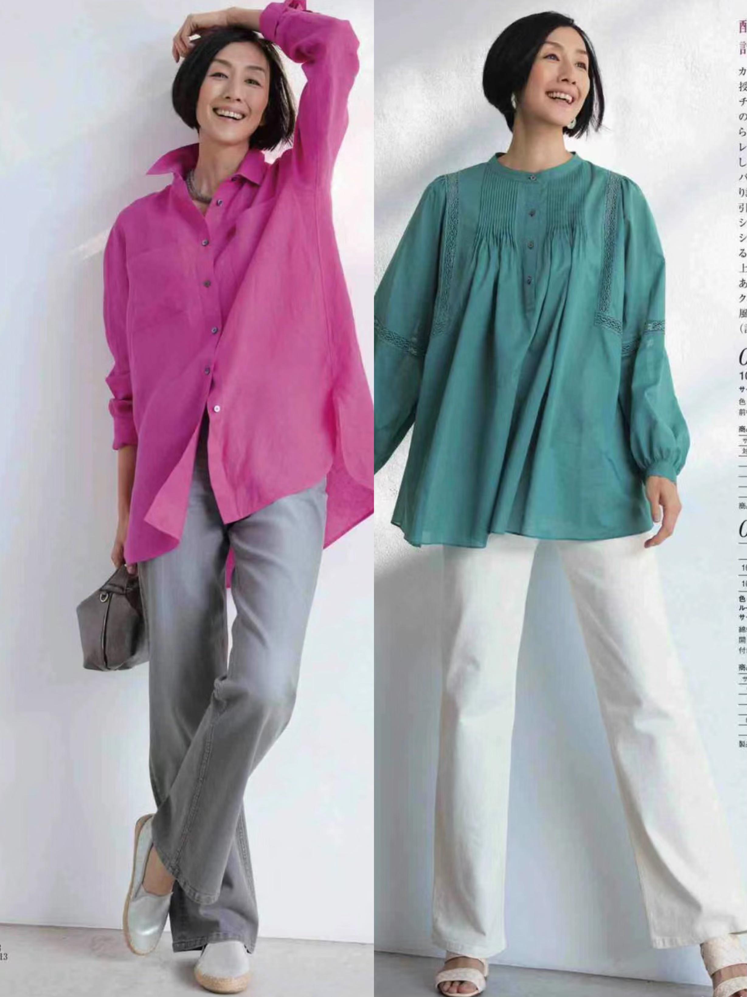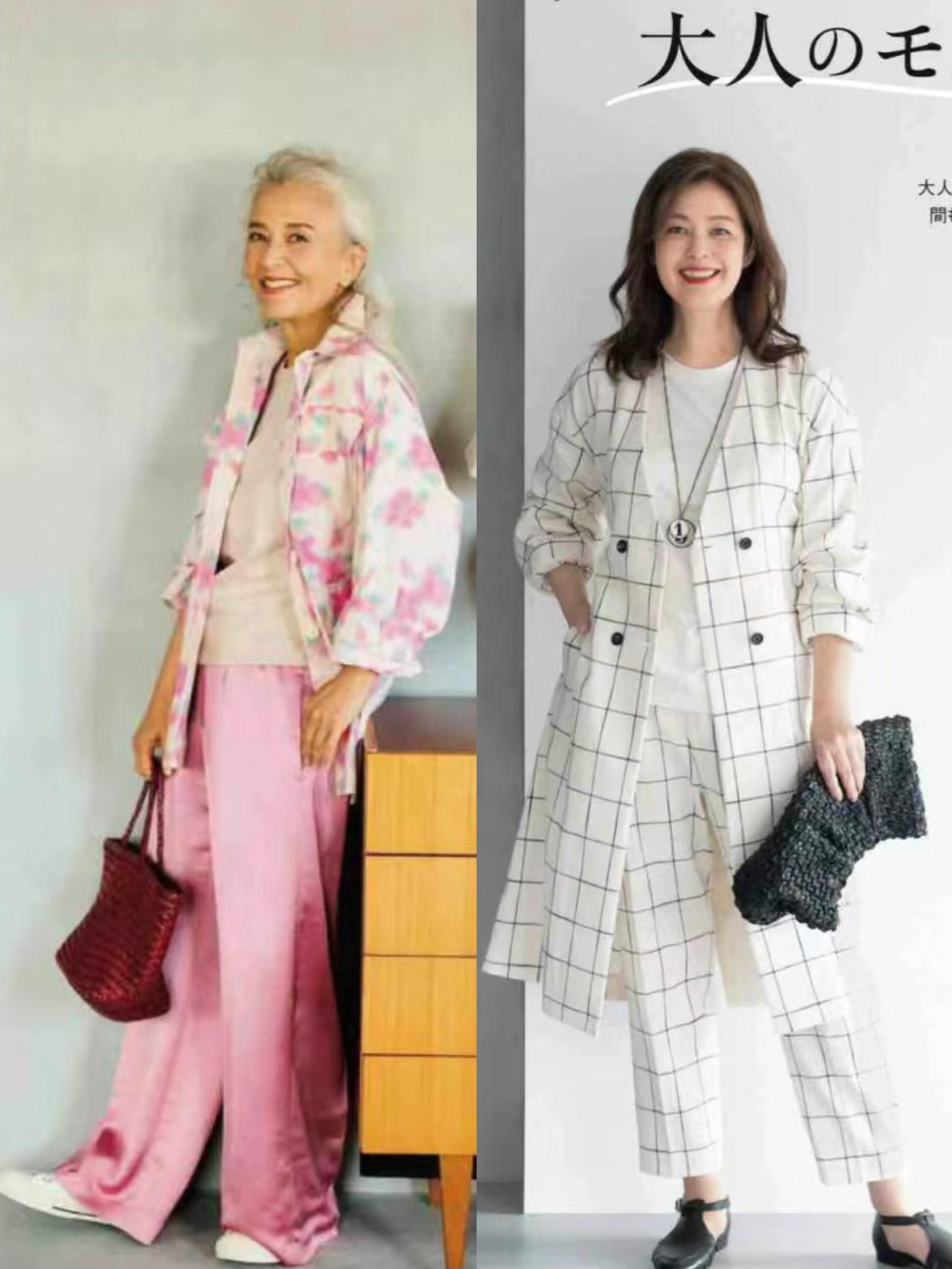 想要更加減齡一點的風格,避免視覺上的老氣橫秋,我們可以多穿亮色系的衣服。比如粉色的印花襯衫、以及高腰的闊腿褲。白色底色的格子套裝,都更加明亮醒目一些。