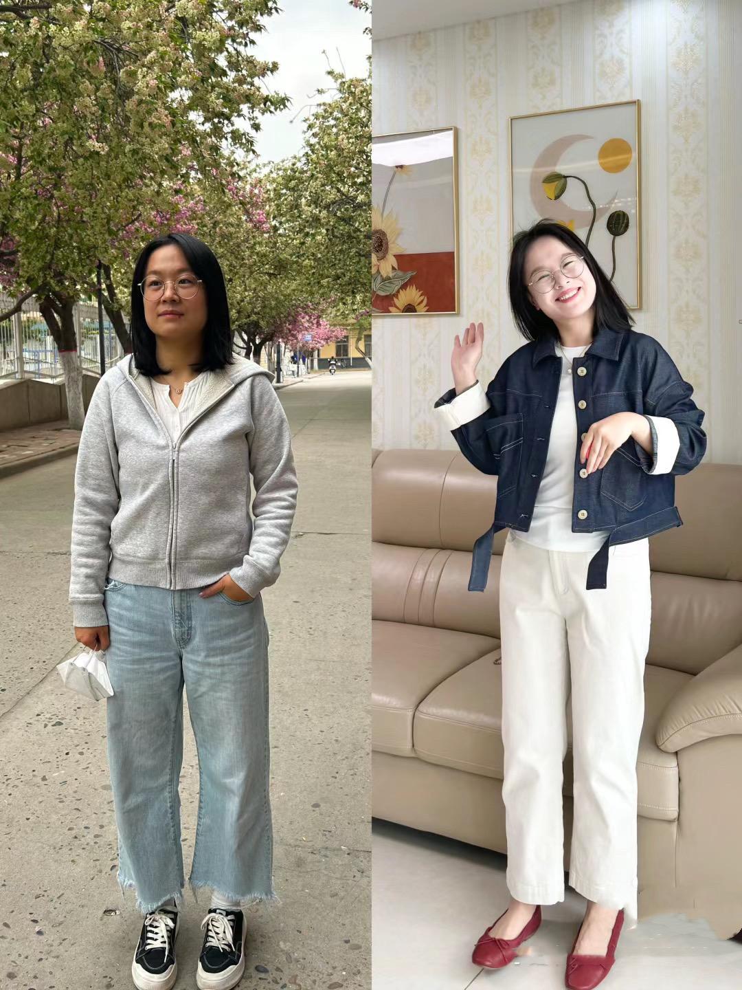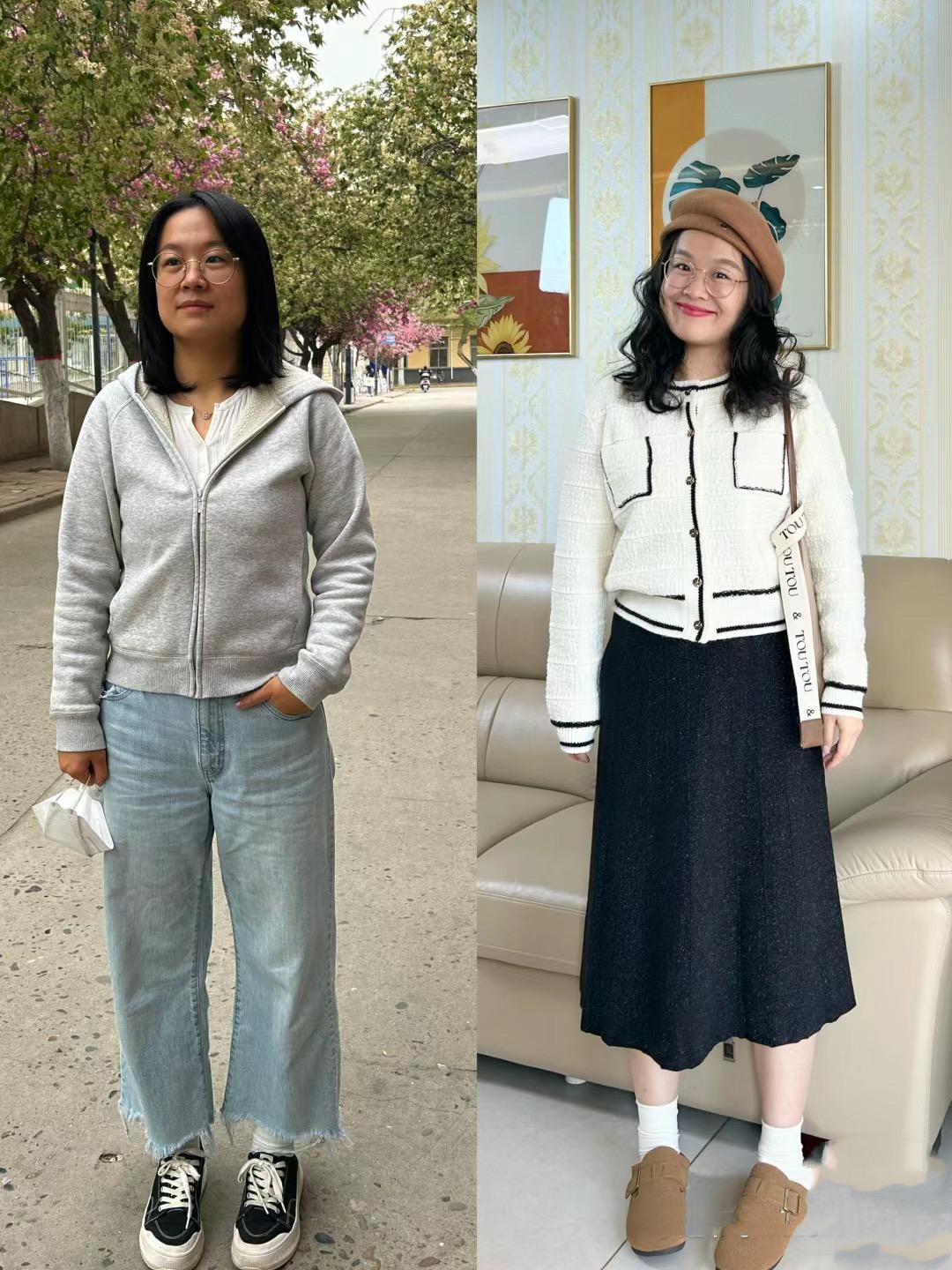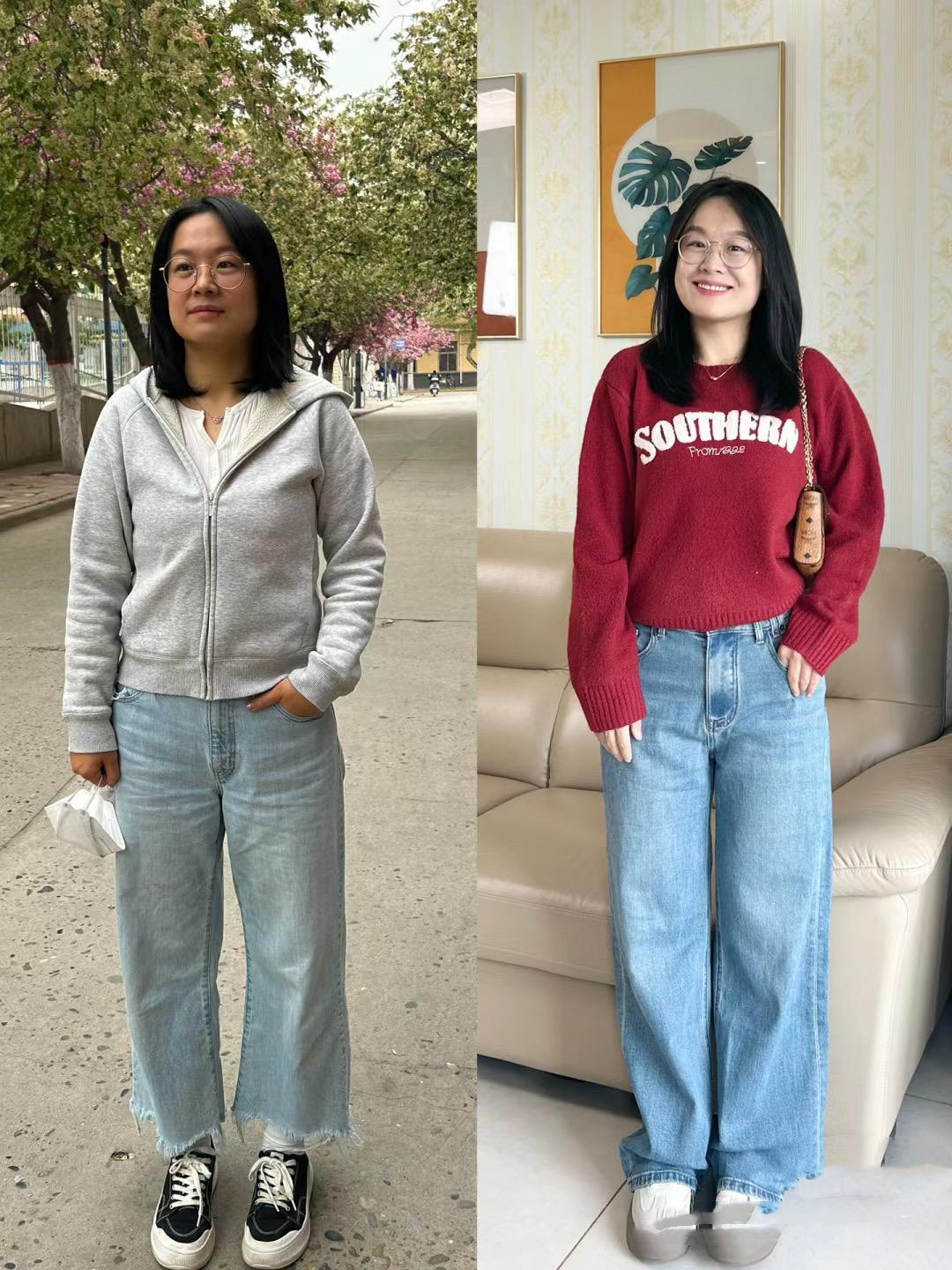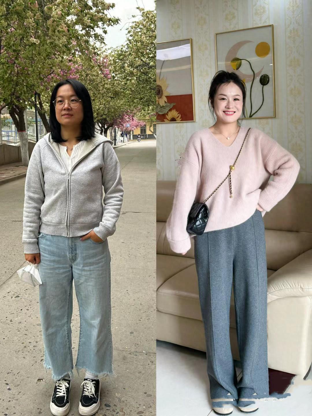 只有對比後才發現,一個女人打扮和不打扮的差別是多麼大。不打扮的時候,穿灰色衛衣開衫,配直筒的磨邊牛仔褲,膚色暗黃透着土氣。