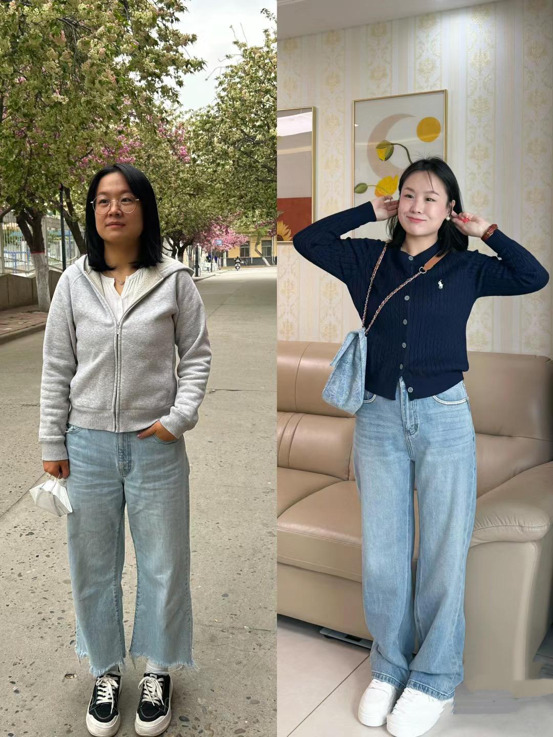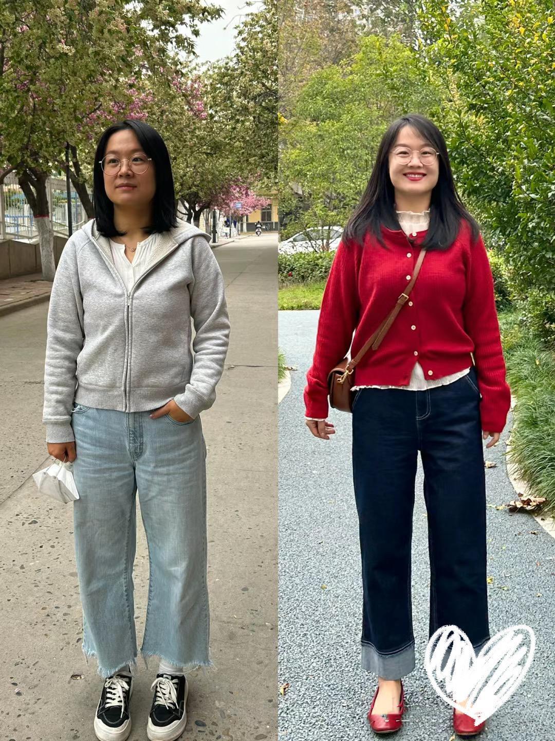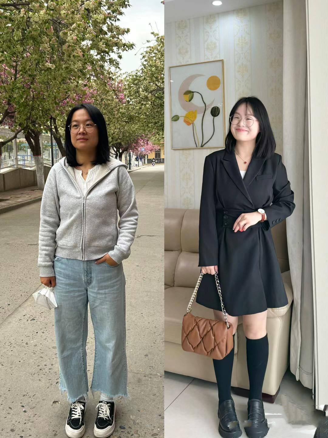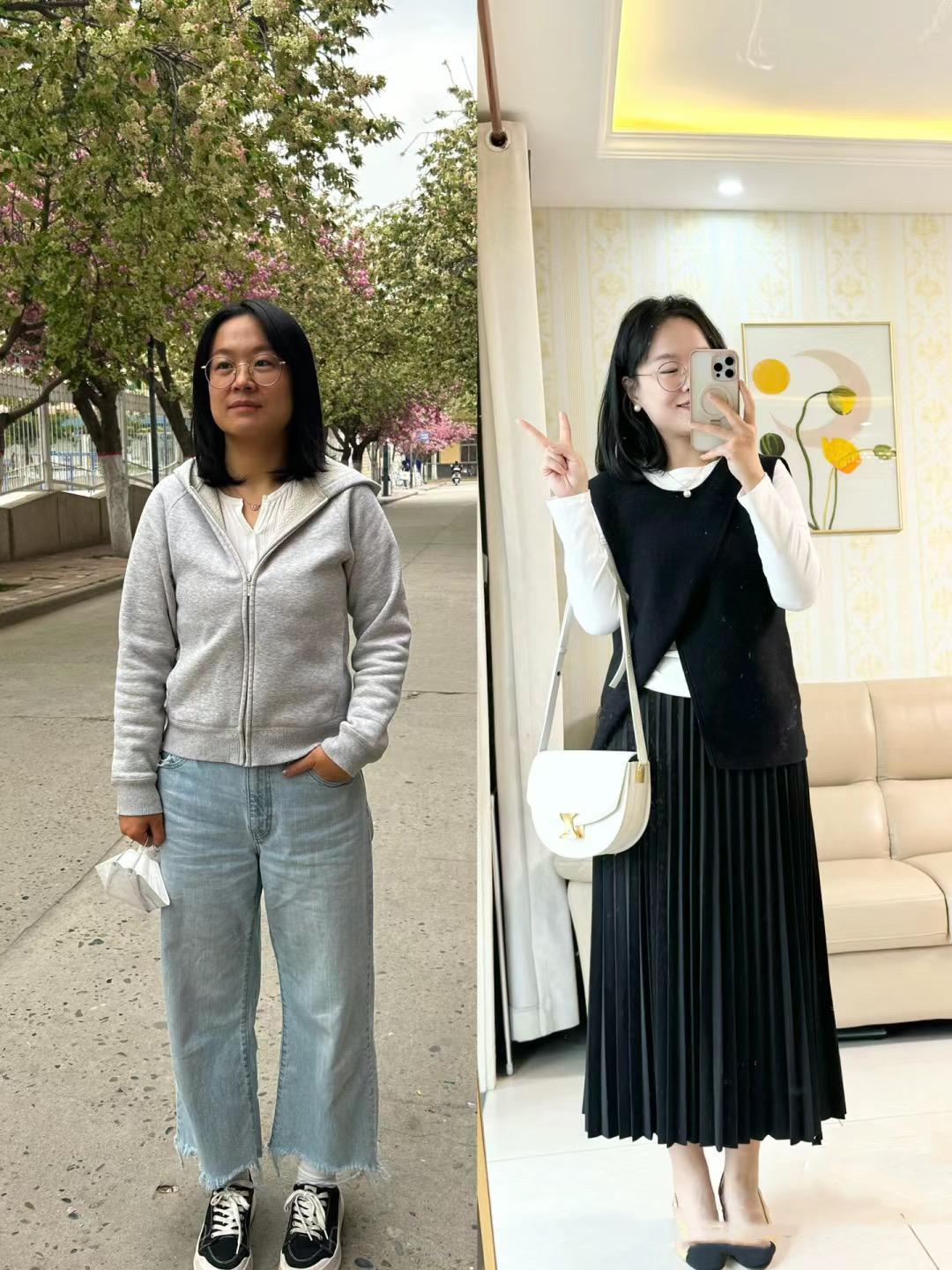 只有對比後才發現,一個女人打扮和不打扮的差別是多麼大。不打扮的時候,穿灰色衛衣開衫,配直筒的磨邊牛仔褲,膚色暗黃透着土氣。
