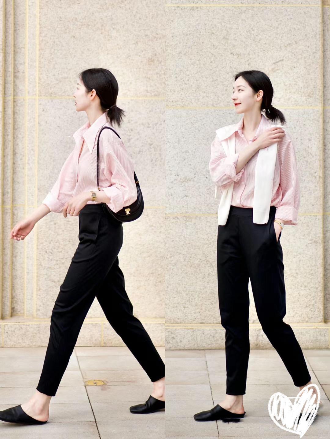 用溫柔的粉色襯衫來搭配經典的小黑褲,高級且體面。黑色直筒褲可以選擇九分褲的剪裁,春天裏露出腳踝更顯輕盈,這種黑色九分褲配粉色襯衫,也溫柔顯瘦。