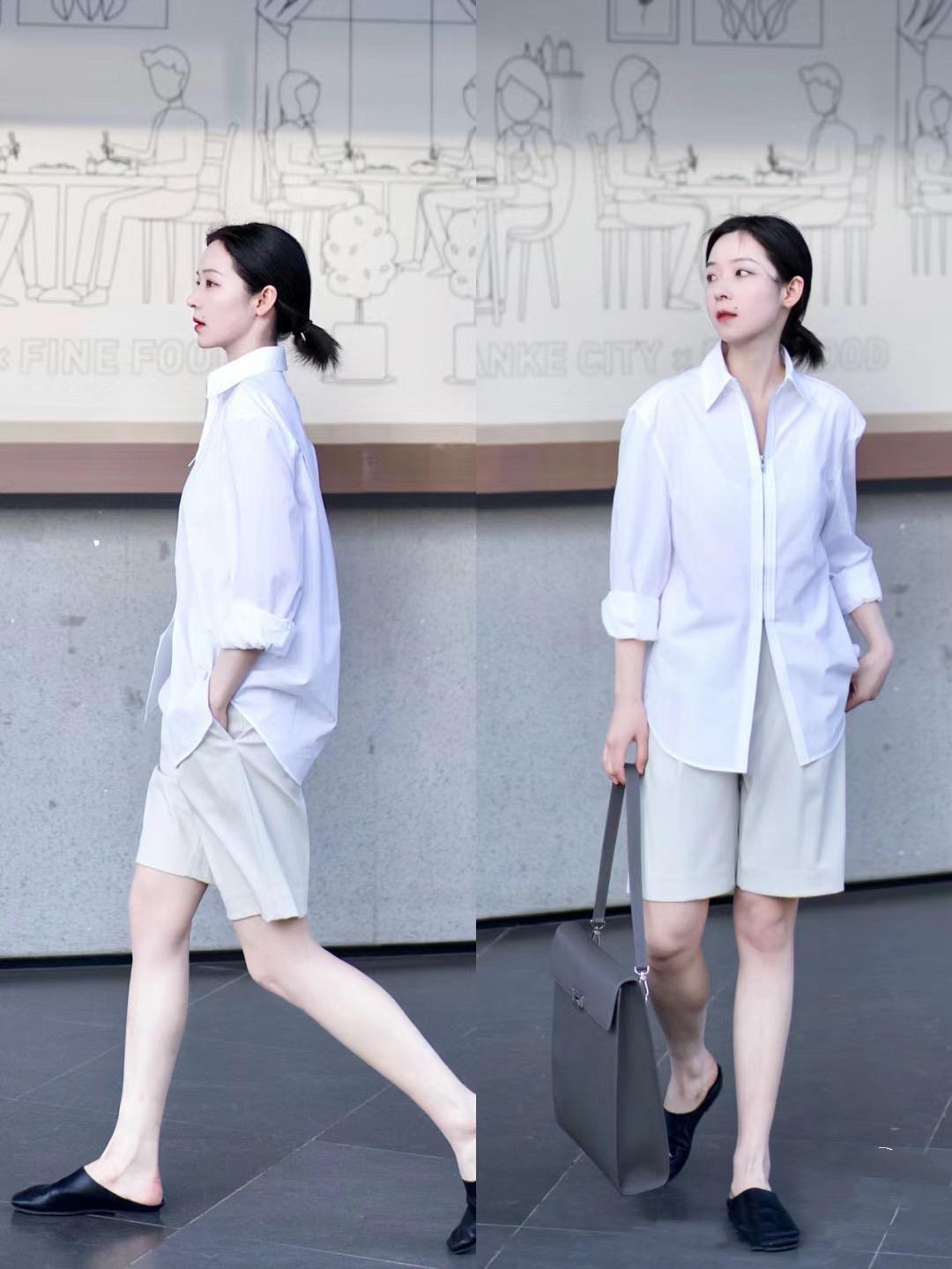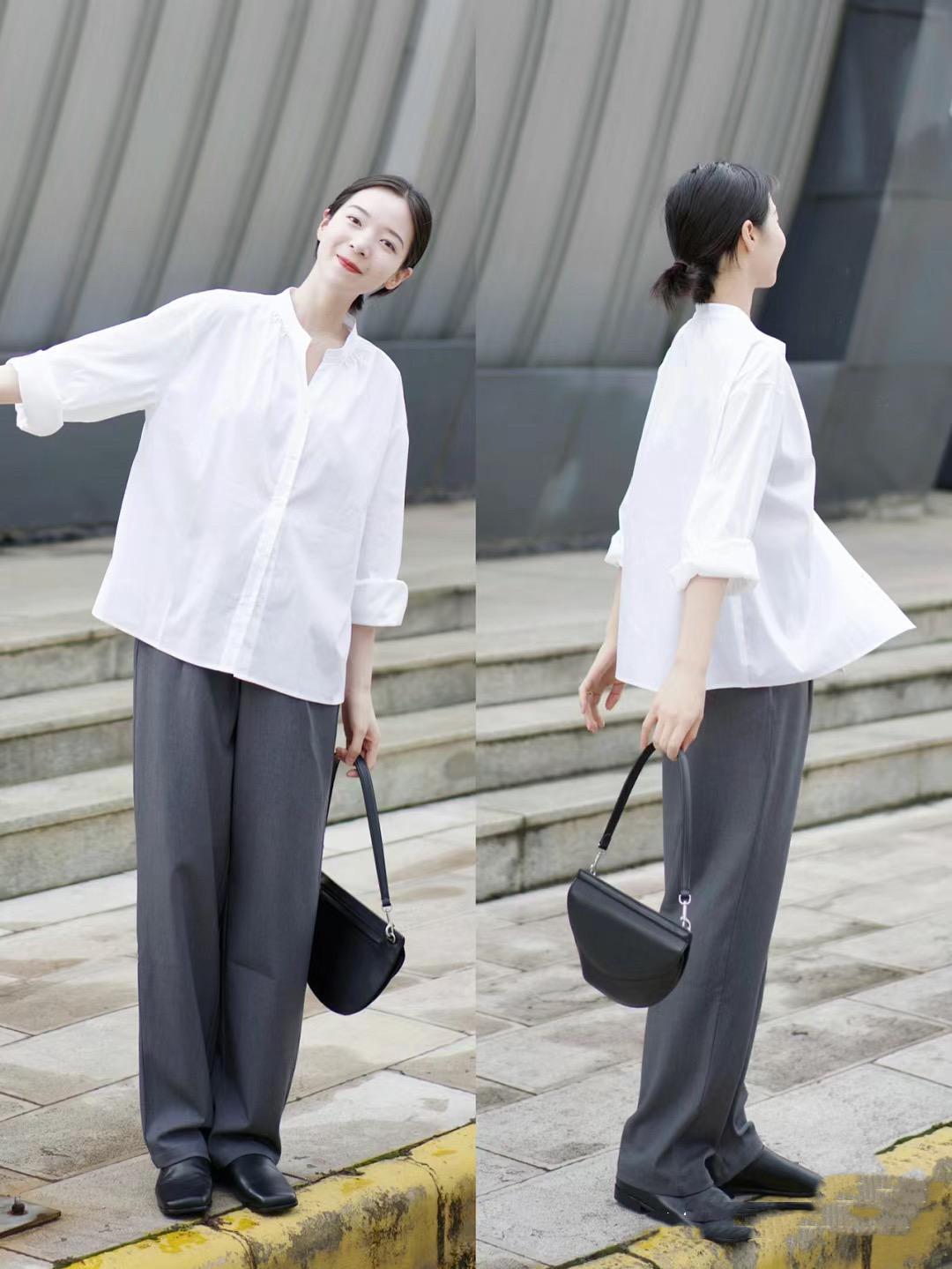 如果是日常通勤,更注重實穿性的話,我們可以選擇款式簡約、不易起褶皺的白襯衫。稍微個性一點的V形領口,還可以修飾頸部線條。