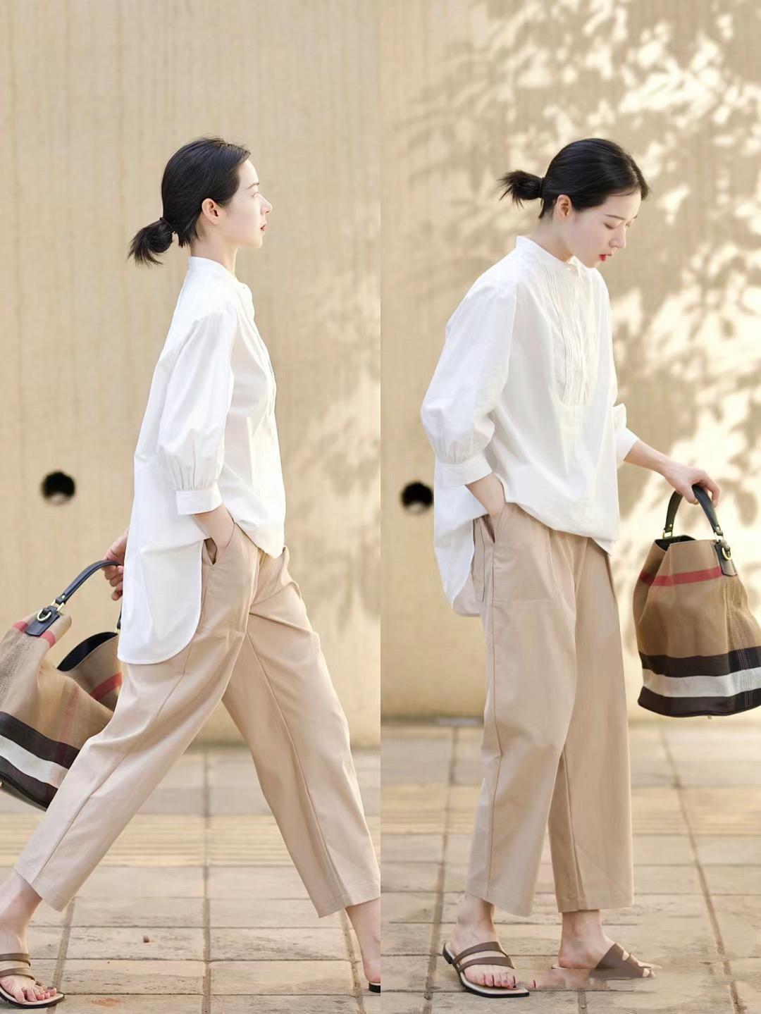 白色襯衫乾淨又高級,可以內搭、也可以疊穿。可以休閒、也可以端莊。春天裏的白襯衫,可以選擇稍微輕盈的款式。告別常規的翻領,選擇小豎領就更加精緻,也不會顯邋遢。