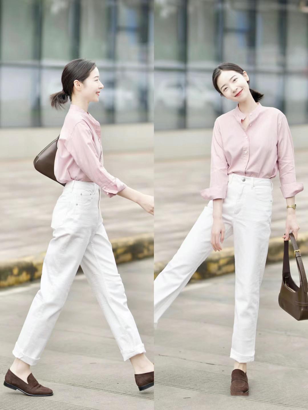 我們穿一件粉色襯衫來搭配經典的白色直筒褲,這種粉白配色高級乾淨,不僅溫柔還很顯貴。裸粉色襯衫搭配了白色直筒牛仔褲,清爽乾淨給人一種很大氣的美。