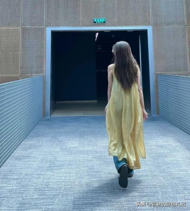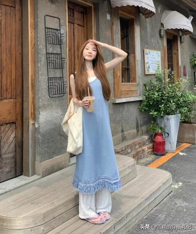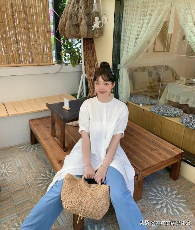 淺色系裙裝的穿搭不要盲目的去匹配白色褲裝,淺藍色的牛仔褲就很好看了,而且藍色調與其他的鮮豔色彩也可以形成較好的銜接感,造型配色不會凌亂也不會單調。