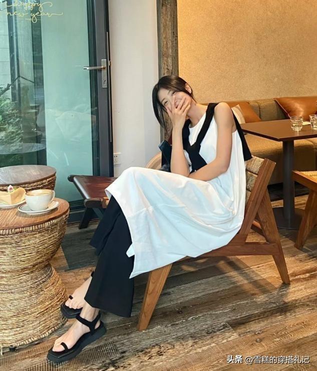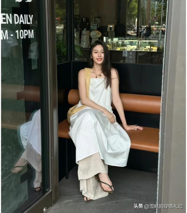 想要讓穿法更加舒適清爽一些,我們就可以選擇無袖款式的長裙,這種直筒長裙並沒有卡腰的輪廓,放大了穿衣空間,自然就更加舒適。一條直筒的闊腿褲只露出褲腳的部位,穿法設計免去了打底褲的緊繃感,着裝更加舒適。