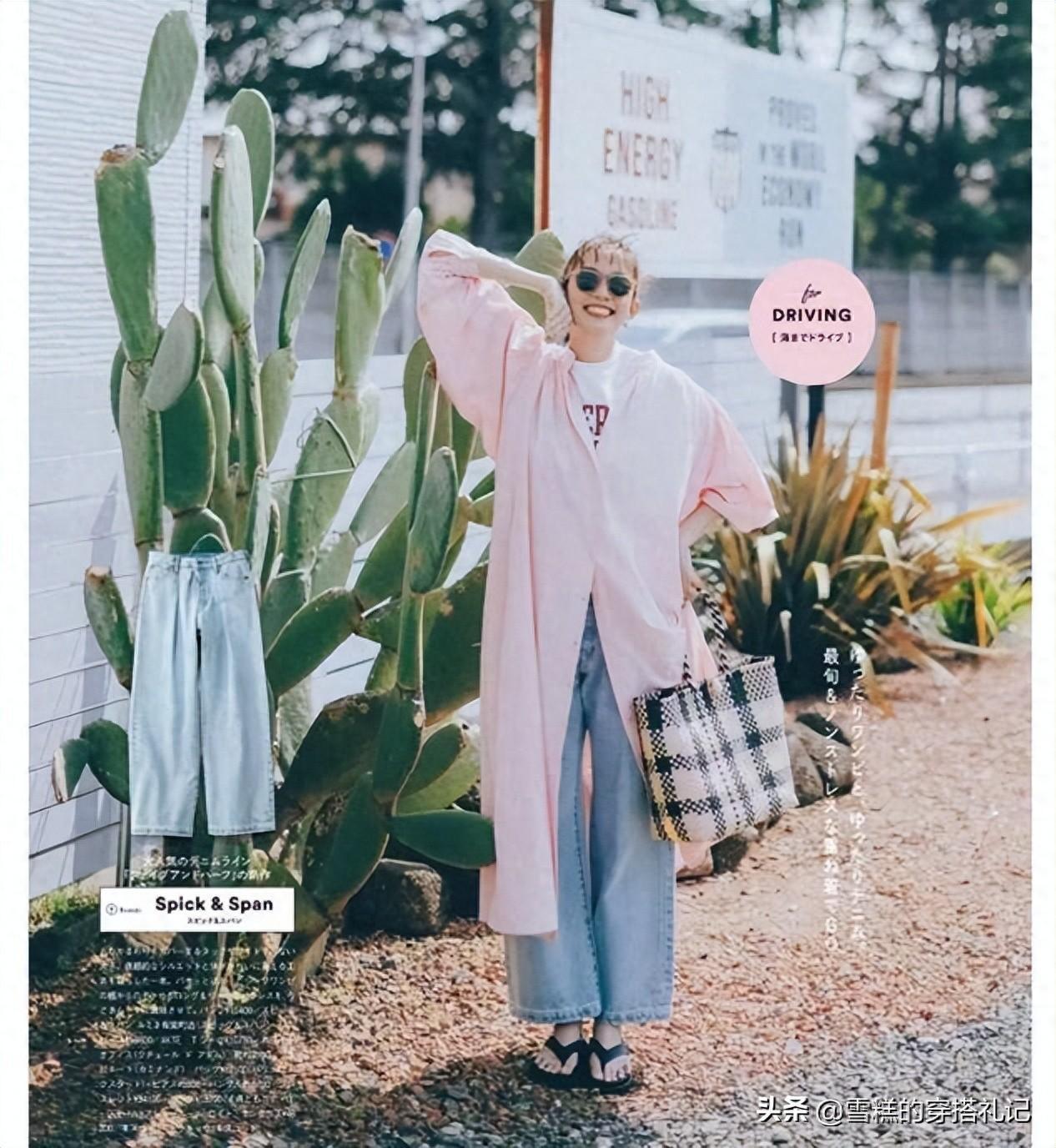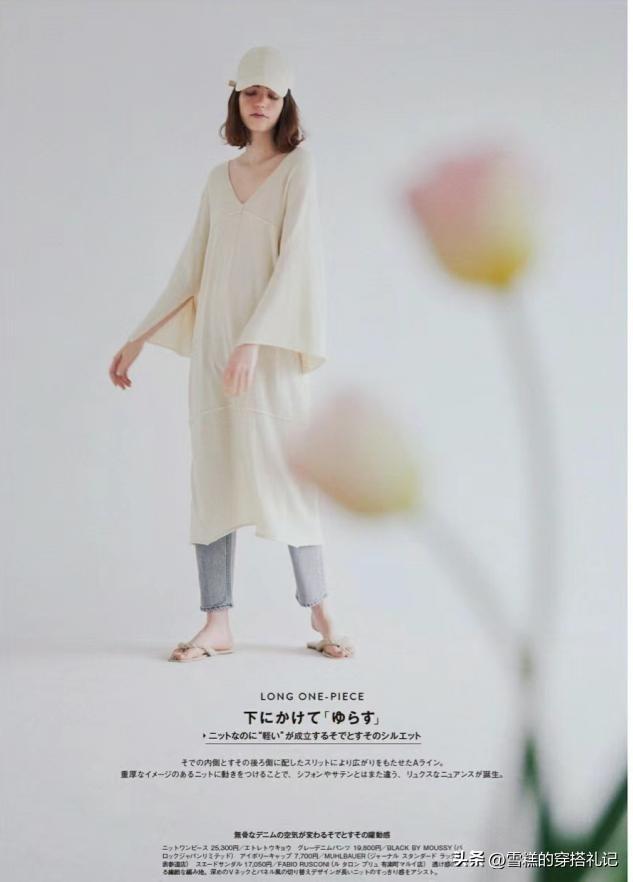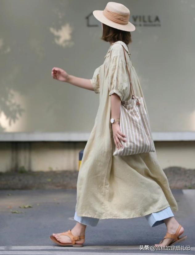 棉麻款式的連衣裙,主打的也是一種大輪廓的慵懶感,可以選擇圖中這種大袖口和大裙襬的走向,穿出大女人或者日雜風格都不在話下,修身款式的小腳褲延展腿型線條,小個子女人也可以輕鬆穿。