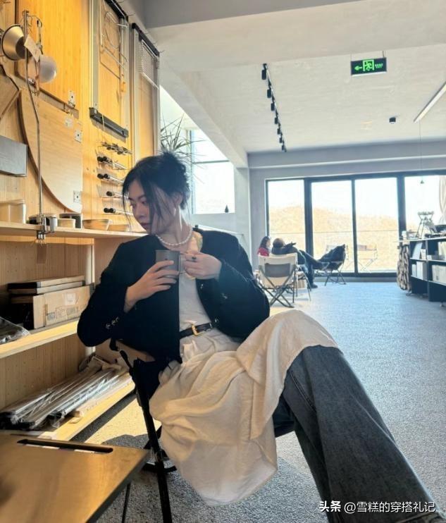 裙子本身的輪廓走向以及線條劃分都是以慵懶感爲主的,那就意味着卡腰的線條並不是最主要的視覺佔比,反而是裙子上半身的穿法可以兩層疊穿,用一件披肩或者開衫款式的外套來凸顯造型的立體度,就可以呼應長裙和長褲的下襬線條層次感。