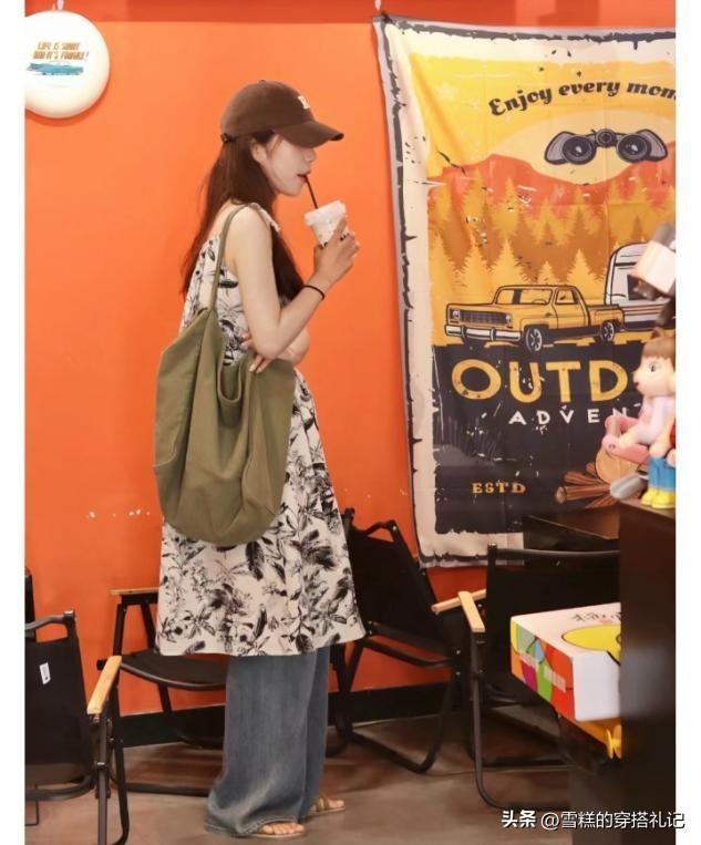 在街頭的時尚穿搭設計當中,碎花裙用來搭配長褲的造型最爲常見,一條半袖款式的雪紡長裙,溫柔時尚感很強,比較簡約內斂的闊腿牛仔褲作爲內襯,整體的慵懶感穿搭達到了極致。