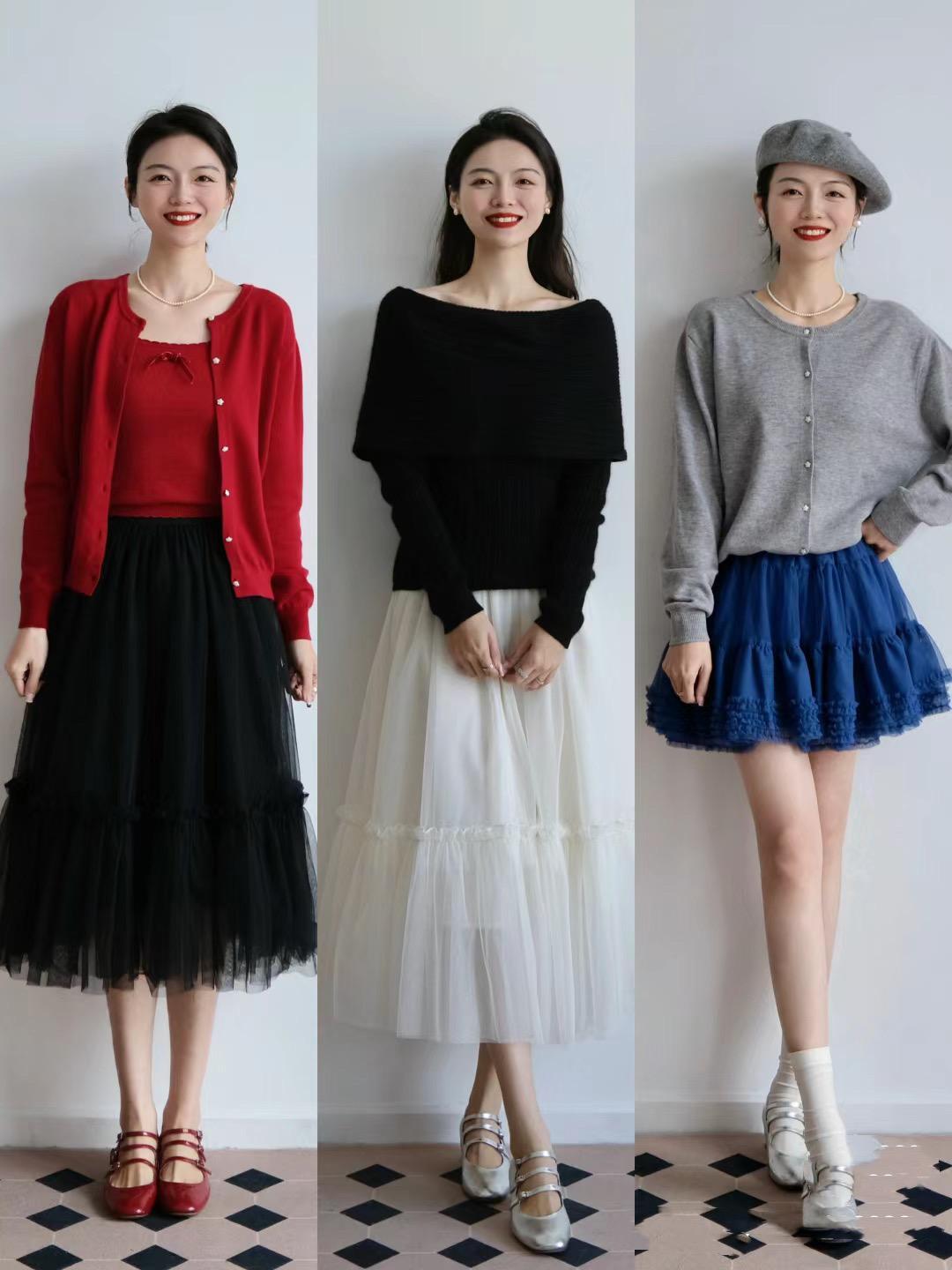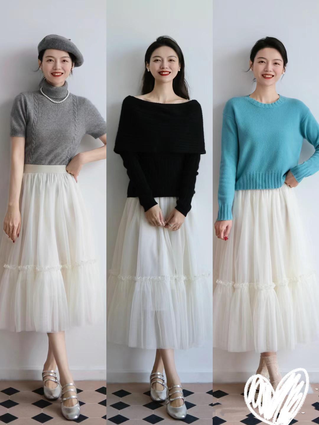 沒想到紗裙與針織衫也是一組完美的組合,針織衫細膩的面料,帶着幾分溫柔、也格外的溫暖。白紗裙輕盈飄逸,高腰的款式自然修飾身材。