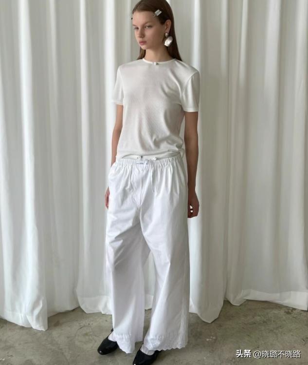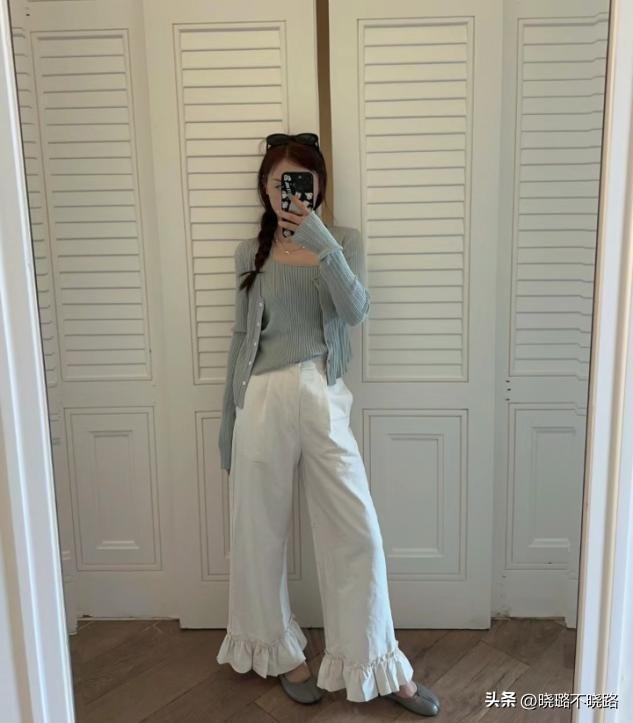 純白色系的褲裝就可以讓末端的花邊輪廓融合在褲子的面料當中,整體的線條感更加從容而又融合,上衣的款式選擇乳白色,稍微展示出一些白色的顏色遞進感,時尚通勤的造型不在話下。