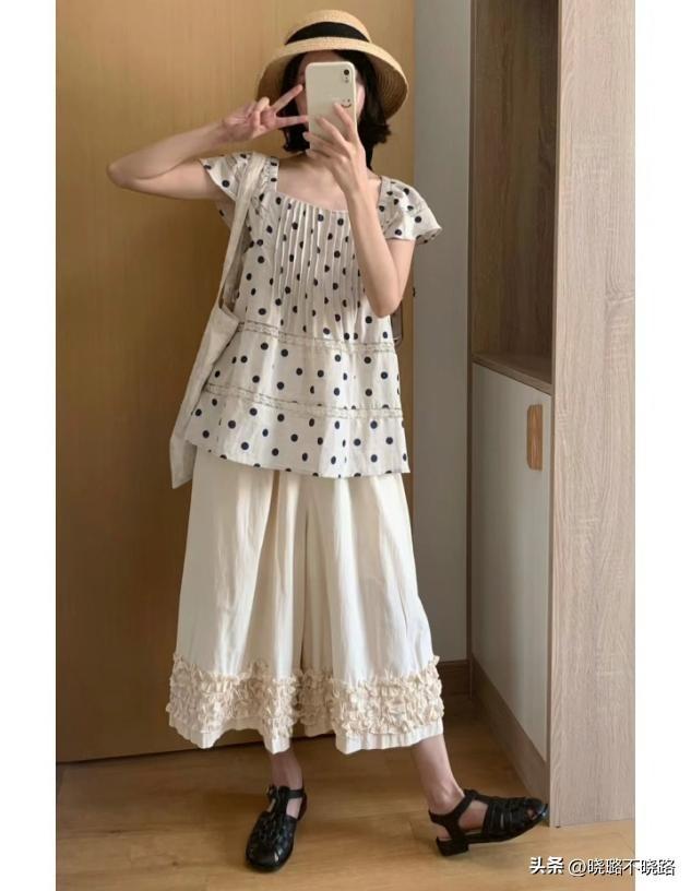 公主褲對於身材線條的維護也是非常明顯的,因爲這種褲子的版型比較偏寬,也就是融合了闊腿褲的直筒版型的特色,營造出來的比較大的穿着空間,可以維護梨形或者蘋果型身材女生的短板,增加上木耳褶皺邊的甜美效果,穿搭的減齡又顯時尚並不難。