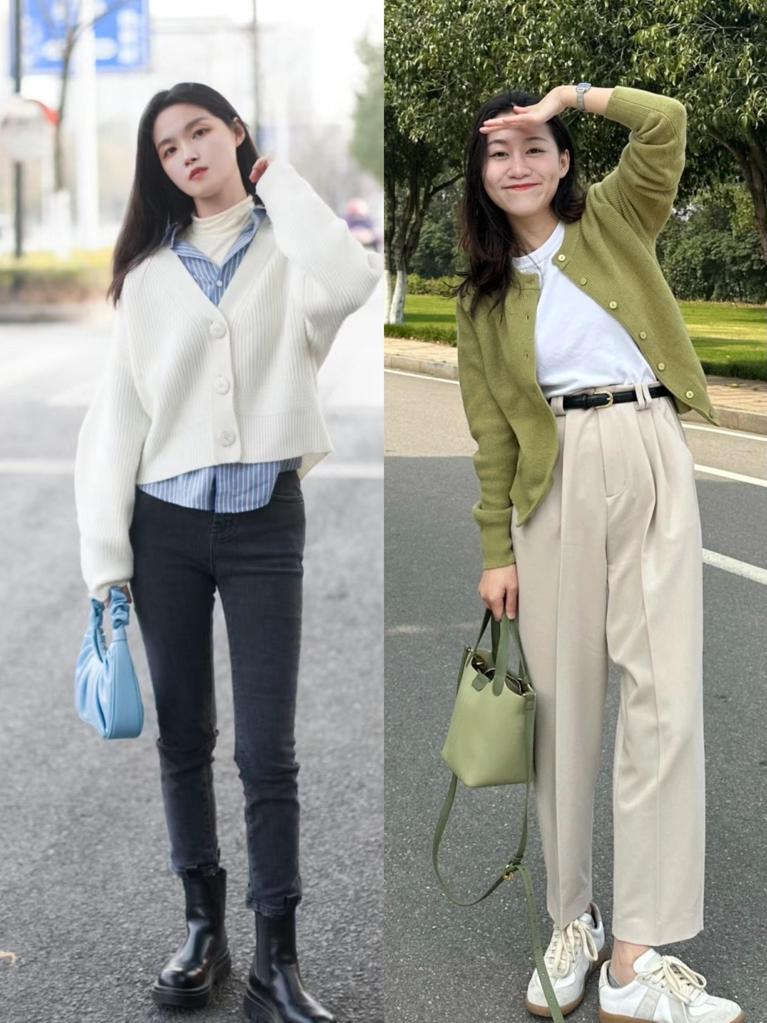 如果擔心奶奶衫+九分褲的搭配太過低調,我們可以嘗試將時尚的疊穿融入其中。比如寬鬆的針織開衫,可以疊搭白色T恤,就唯美又大方。