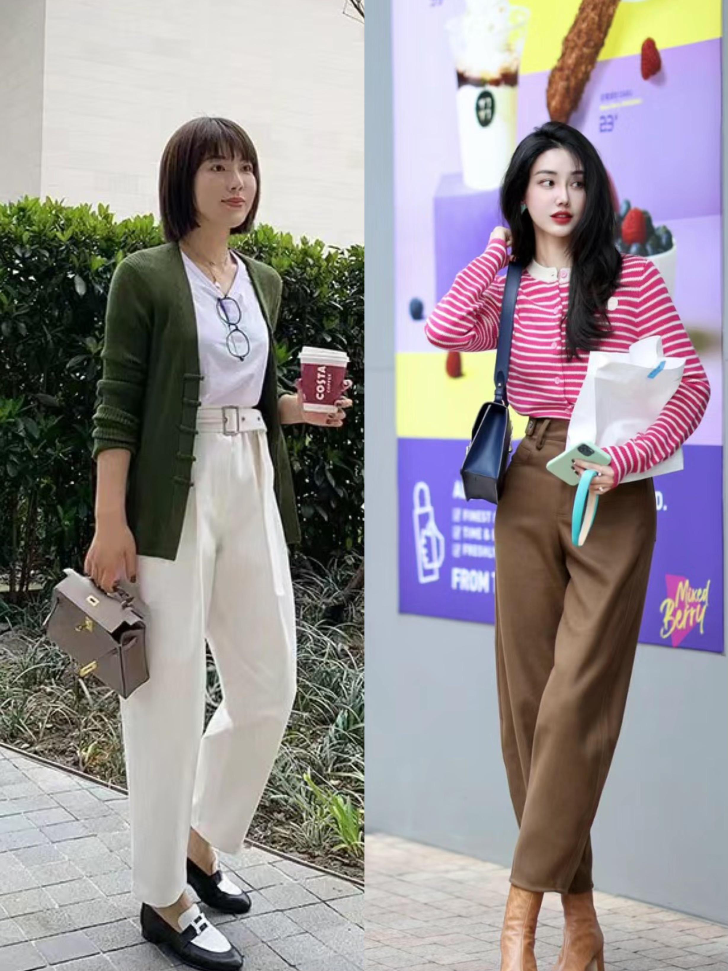 修身的奶奶衫、或者寬鬆的奶奶衫,都可以搭配高腰的九分褲。錐形九分褲,上寬下窄的設計、可以在一定程度上修飾腿型,顯得身材更加挺拔,穿衣風格更爲利落。