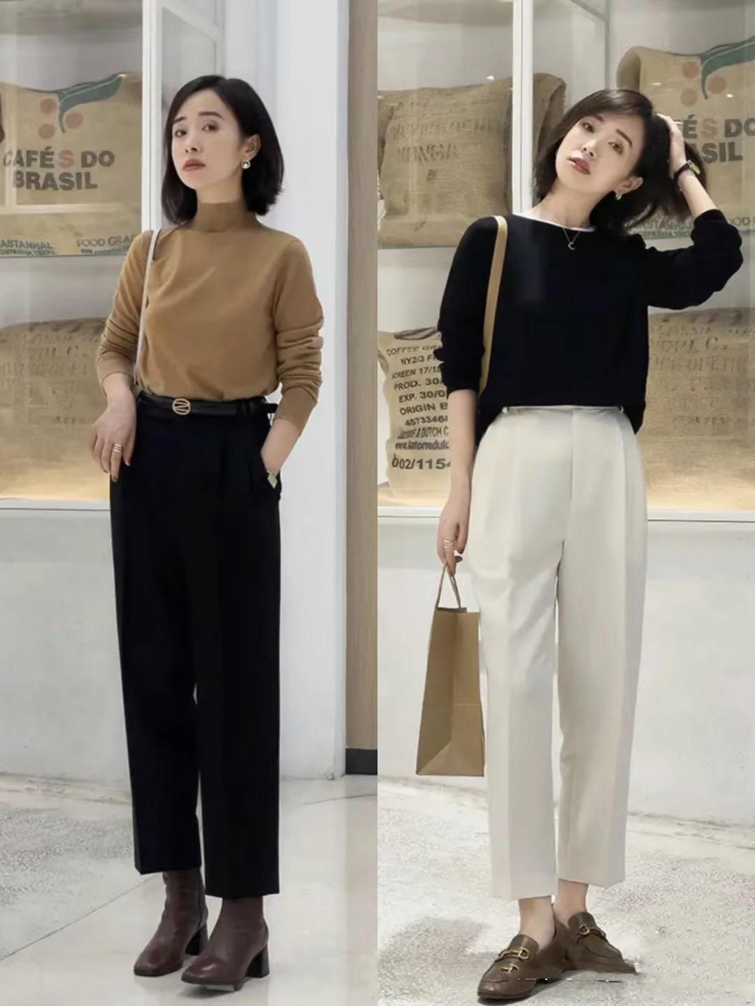 亮色系的針織衫,可以搭配深色系的九分褲。或者深色系的針織衫來搭配亮色九分褲。融入一定的亮色,會讓我們的穿搭更加減齡,還有一定的顯白效果。