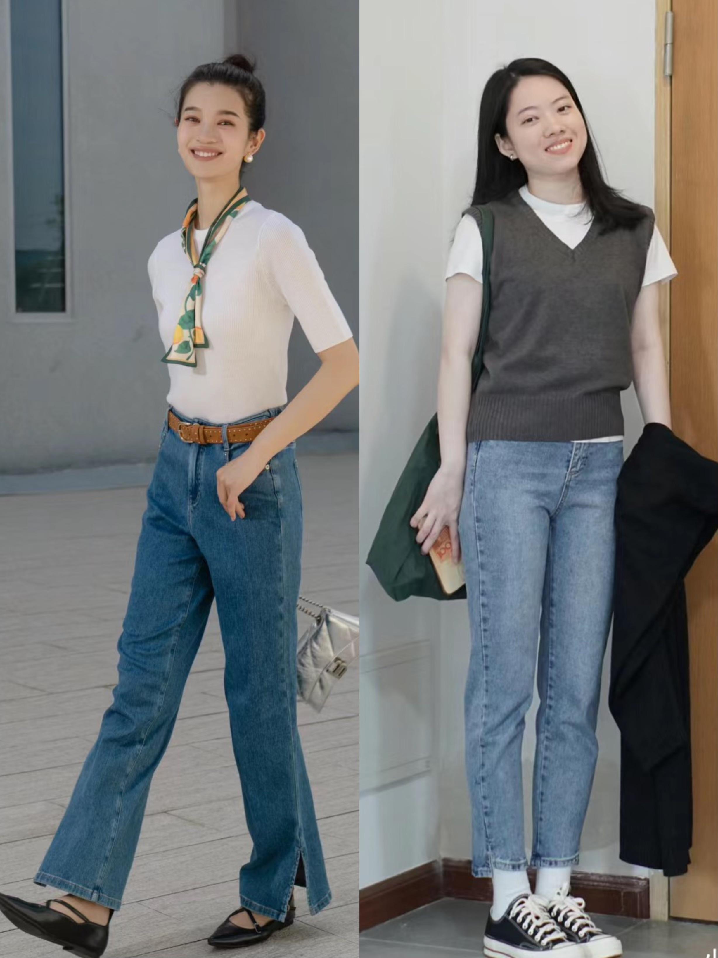 比如寬鬆一點的針織衫,我們將針織衫的下襬塞進直筒牛仔褲的褲腰裏,不經意間就塑造出高腰線。在高腰九分牛仔褲的對比下,比例優越、雙腿修長。
