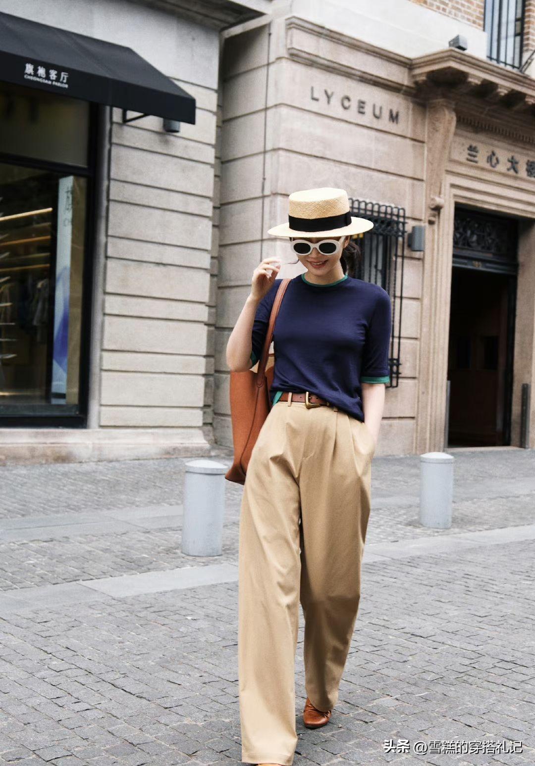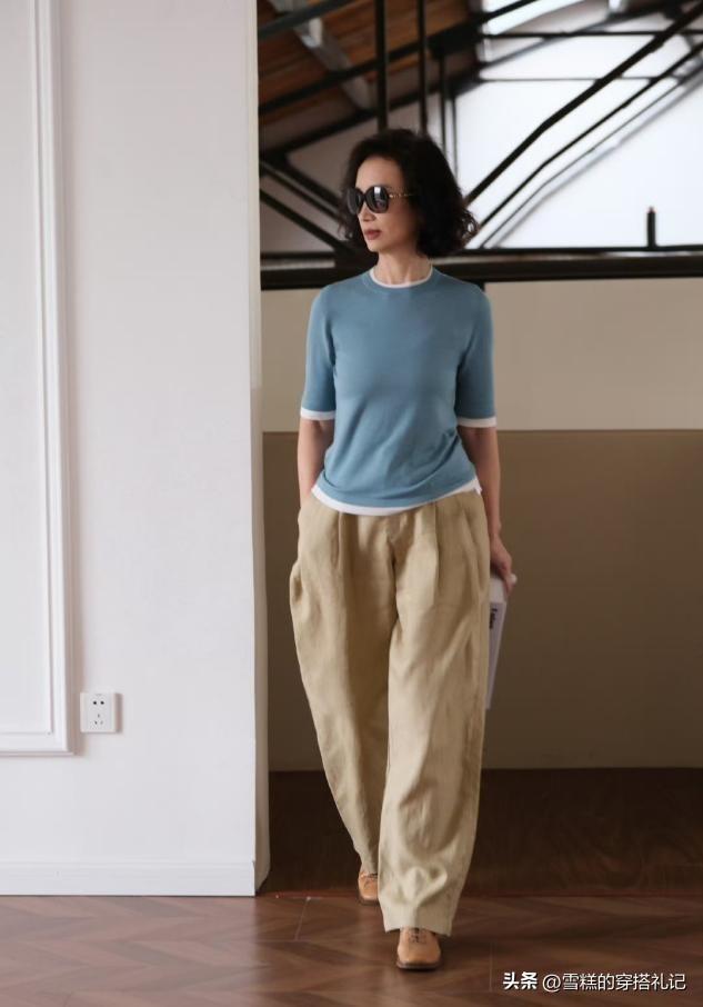 中年女人如果想要穿稍微亮一些的彩色服裝,需要在上半身當中加入一件奶杏色的服裝進行過渡。比如這件天藍色的針織短袖,莫蘭迪的色調格外的溫柔有質感,疊加一件奶杏色的打底衫,微微的露出一點領口即可,輕鬆的化解了彩色繫帶來的豔俗感。