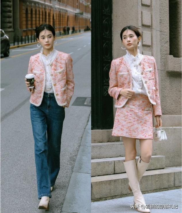 通過小香風外套去組合裙裝和褲裝的對比,我們可以很明顯的看到深色系的牛仔褲能夠維護腿型更加纖細修長的效果,而且高腰款是褲裝的線條,拉扯感也比短裙要更明顯,能夠清晰的劃分出你的腰線位置,小個子女這樣就更容易顯高顯瘦。