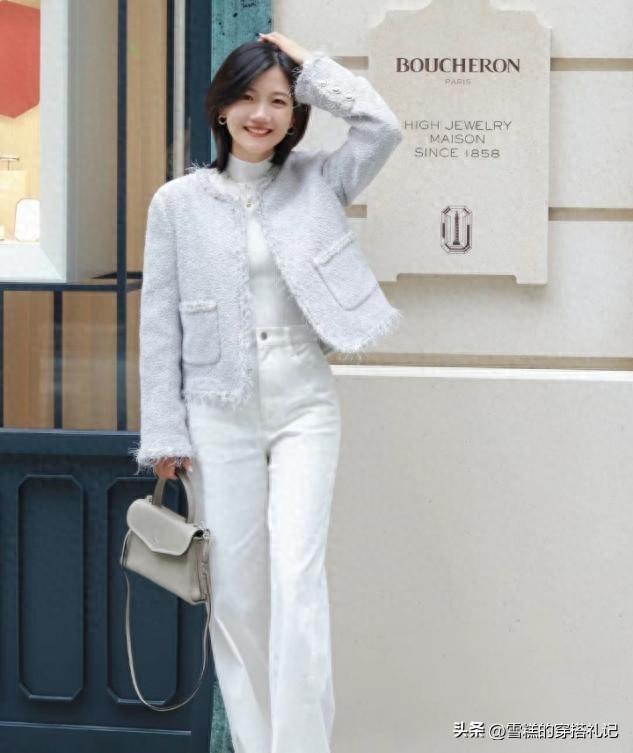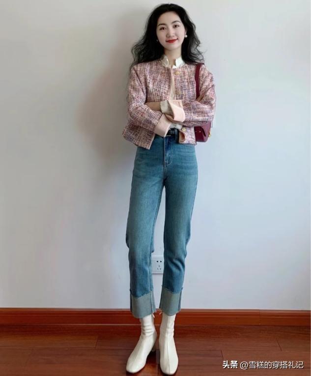 想要讓你的小香風與牛仔褲的搭配更加出挑的話,我們可以在面料上去下一點功夫,比如上衣的質感可以偏厚一點,這樣上半身的輪廓更加立體,但是褲子的單層面料是剛需,穿着舒適又輕盈,打造一種上下面料混搭的視覺效果。