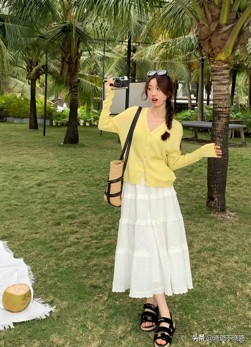 糖果色的奶奶衫,在春天也是很受歡迎的,只不過,像這種淺亮色的開衫,領口要大一些,版型要修身一點,穿在身上才更好看。如果奶奶身的顏色比較亮,那麼裙子就可以選擇中性色。