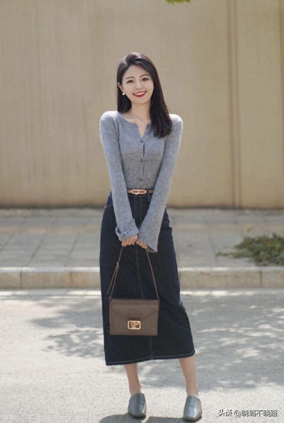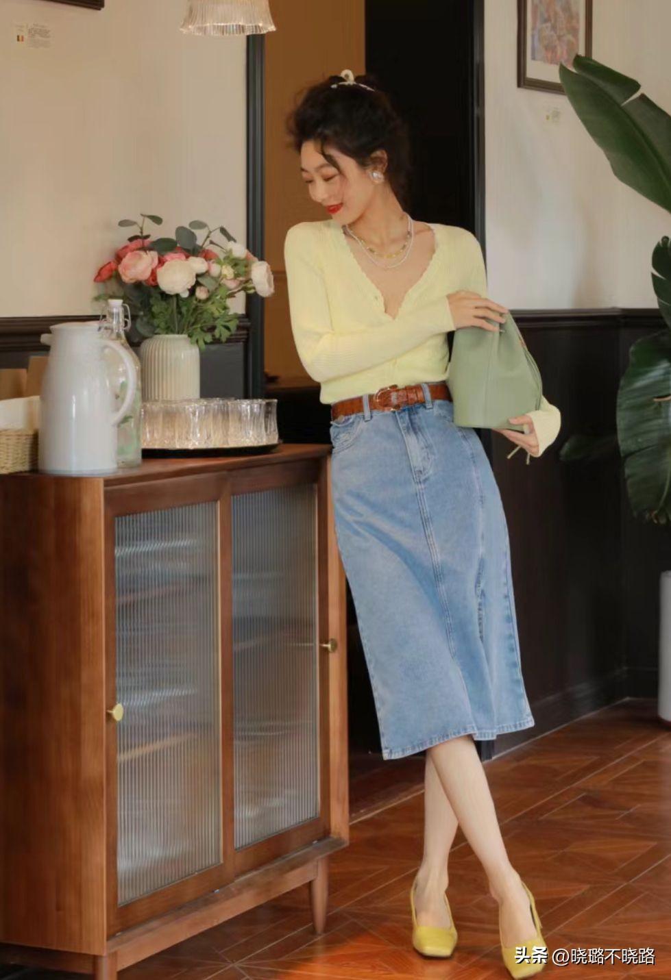 丹寧藍色牛仔直筒裙,和糖果色奶奶衫簡直就是絕配!裙裝長度露出一截纖細的小腿線條,搭配上和奶奶衫同色系的平底單鞋,分分鐘穿出“誰都沒我美”的感覺。