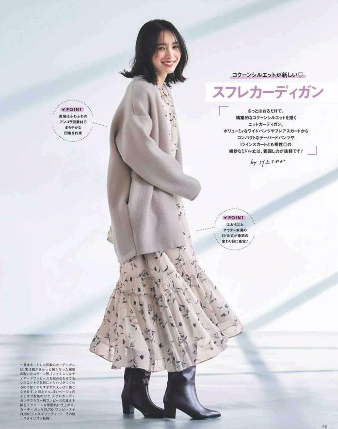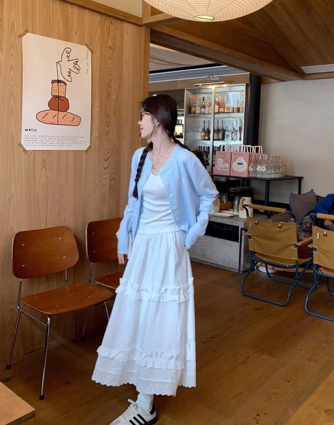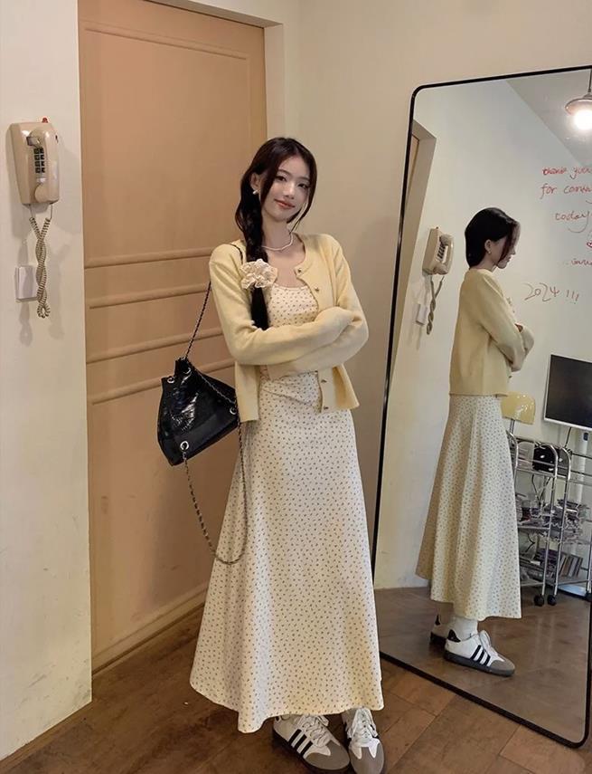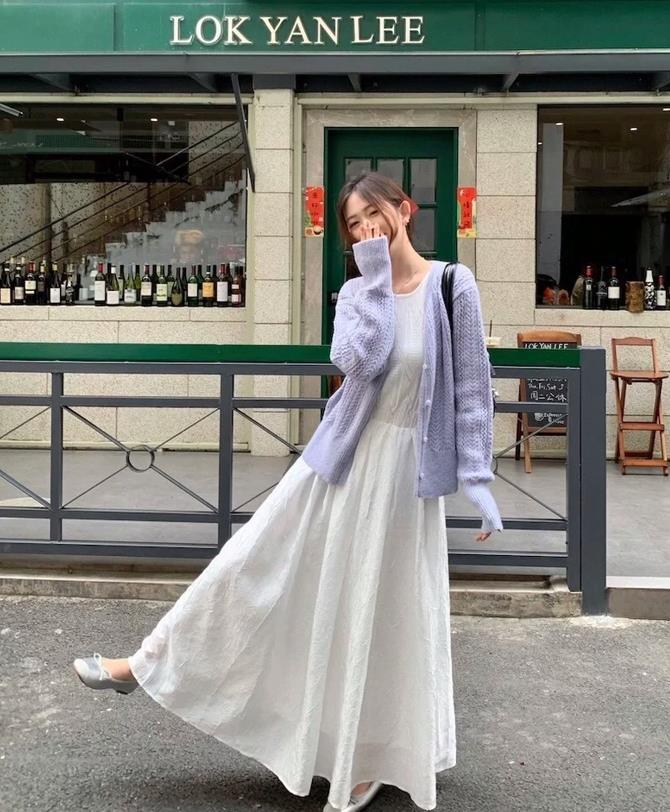 輕薄的針織衫和裙子疊穿,不僅保證了溫度還時尚,柔軟的針織開衫與裙子的飄逸感結合,將屬於女性的溫婉氣質展現出來。