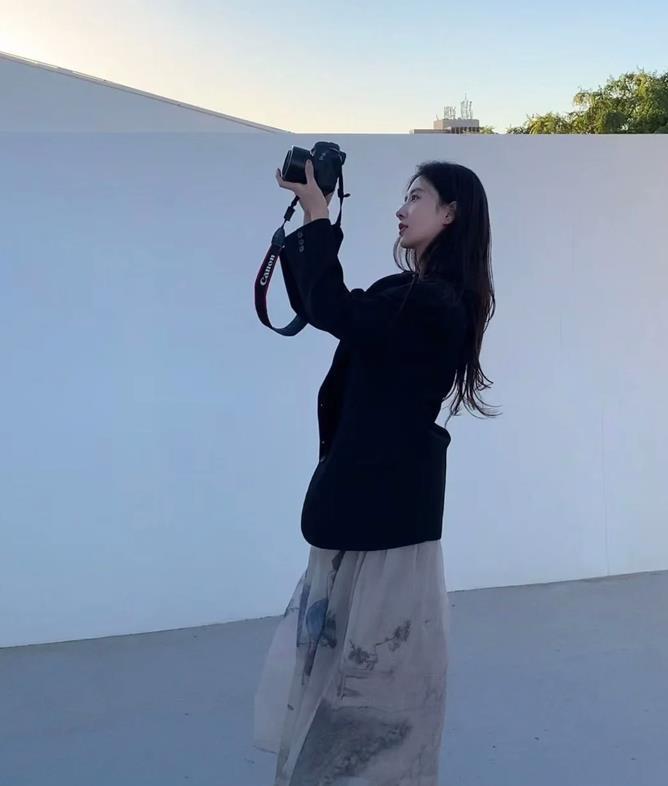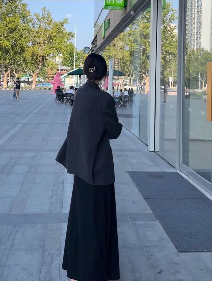 硬朗幹練的西裝外套,與裙子疊穿一起,形成了一種獨特的時尚風格,這種搭配不僅適合職場,也適合在日常休閒的時候穿,能很好展現出女性的獨立和自信。