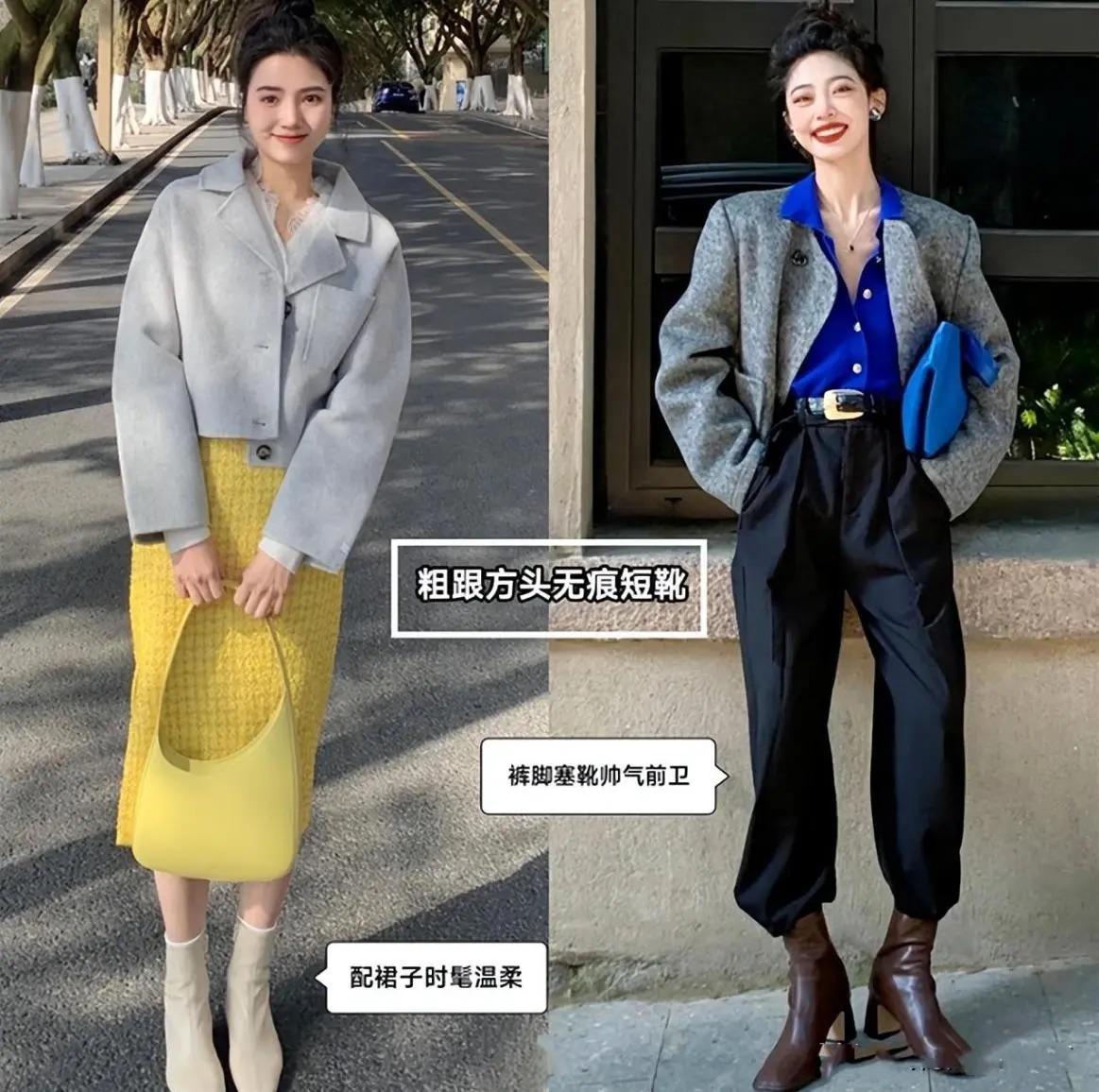 粗跟的方頭短靴,既具備了一定的穩重性,又更加舒適百搭。不管是配裙子、還是配褲子,這種粗跟方頭無痕短靴,都比較時髦洋氣,給人一種利落高級的美。