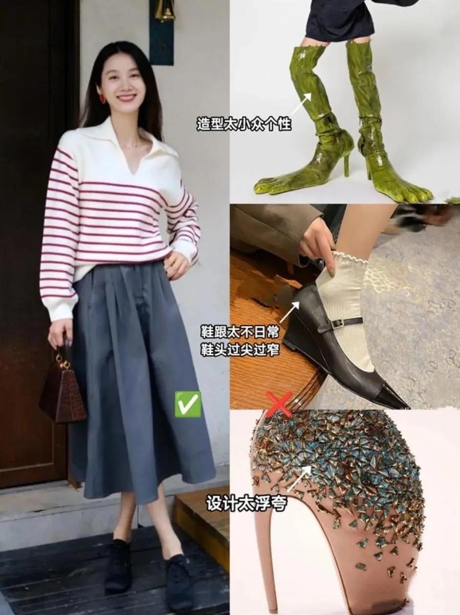 造型太小衆、鞋跟不日常、或者鞋頭過尖過窄、以及裝飾太醒目的鞋子,都容易穿出突兀感。與中年女性的優雅、穩重,形成鮮明的對比,視覺上也不夠大方高級。