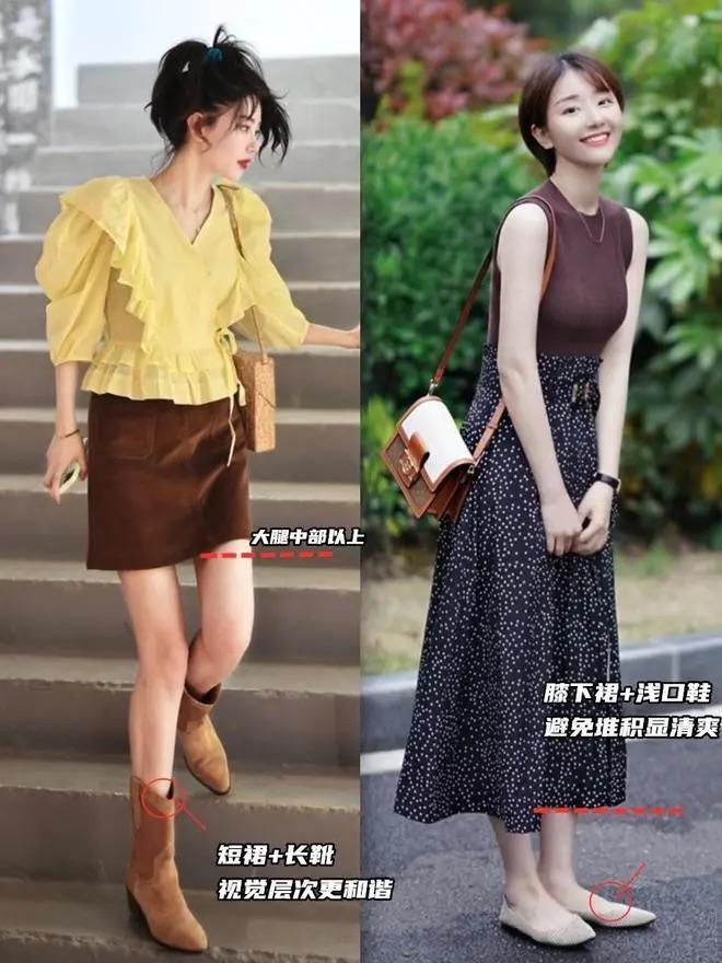 春天裏不管是穿着長靴還是淺口鞋,都需要注意塑造出適當的露膚感。用短裙搭配長靴,或者用長裙搭配淺口鞋,都可以表現出輕盈感。
