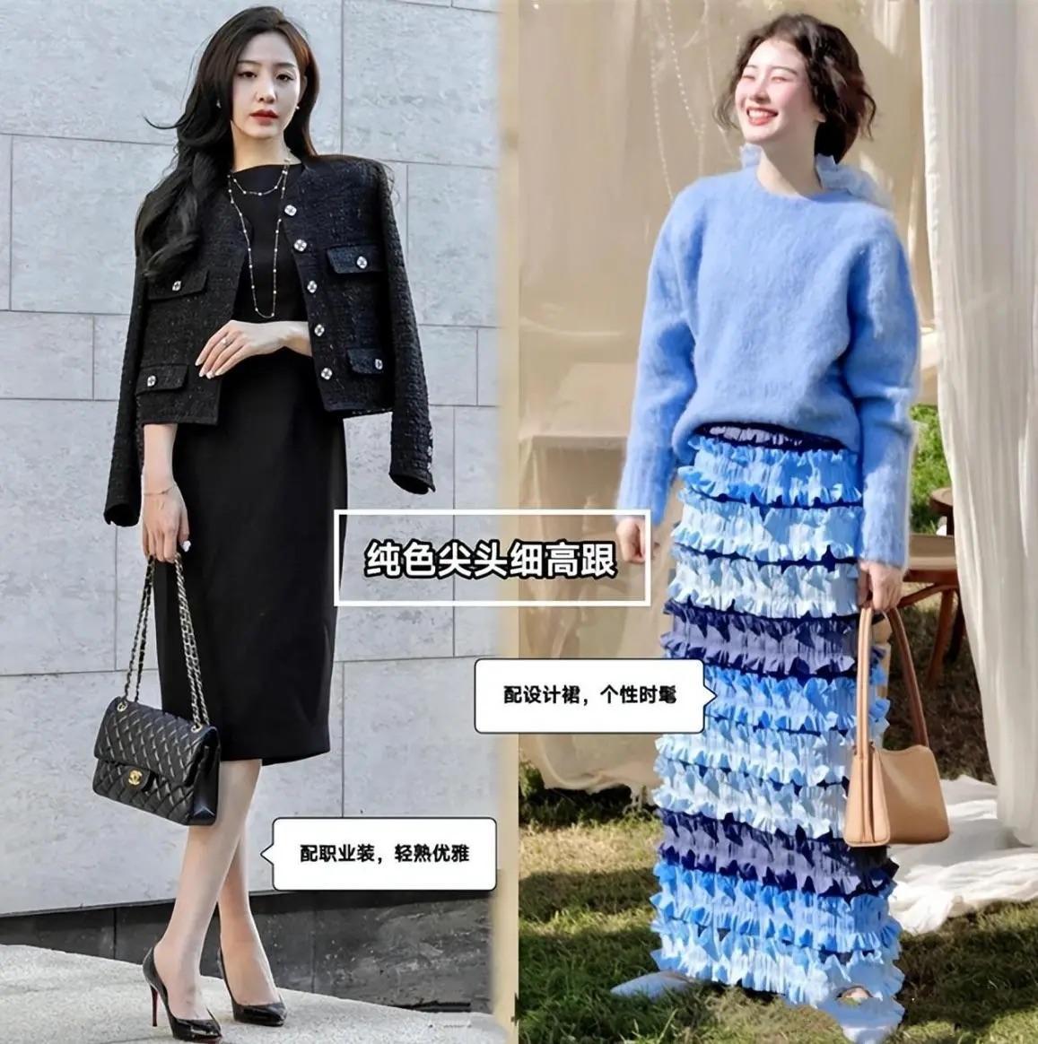 選擇尖頭細高跟鞋的時候,可以稍微注意鞋跟的高度。鞋跟的高度不需要太浮誇,一般保持在5cm以下就更容易駕馭。用純色尖頭細高跟鞋子,搭配精緻的套裙也很提氣質。