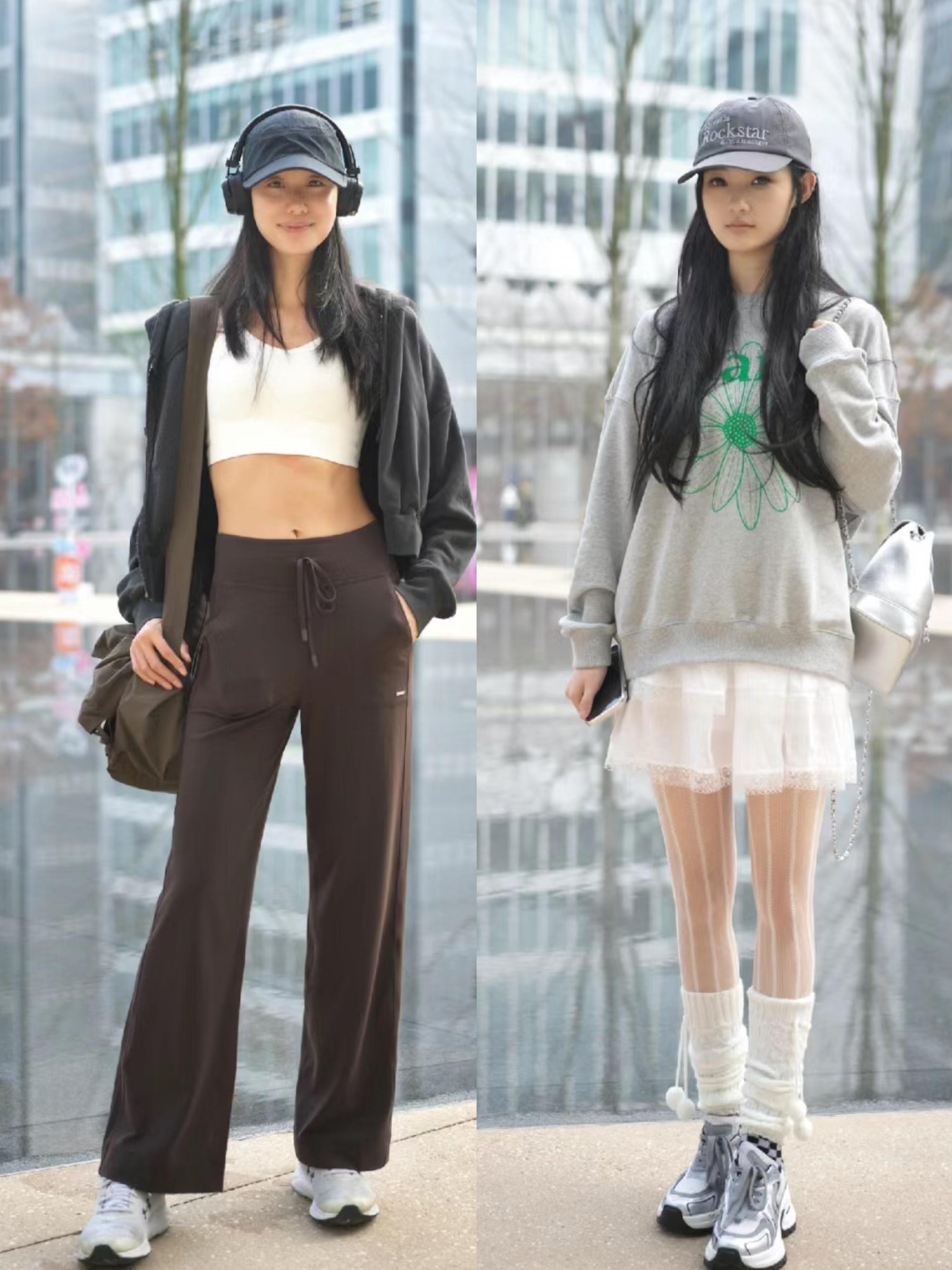 比如露臍背心與運動套裝的搭配,就更加酷颯醒目。或者衛衣+半身裙,配上透視感的白絲襪,也會塑造出更加醒目惹眼的效果,讓基礎的穿搭變得時髦起來。