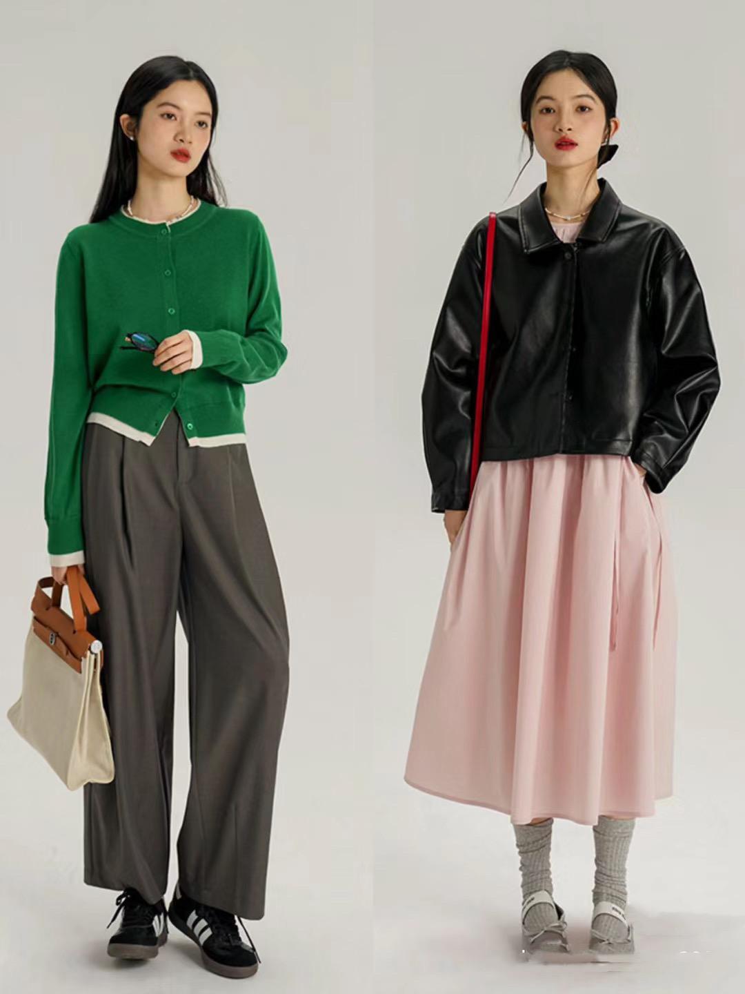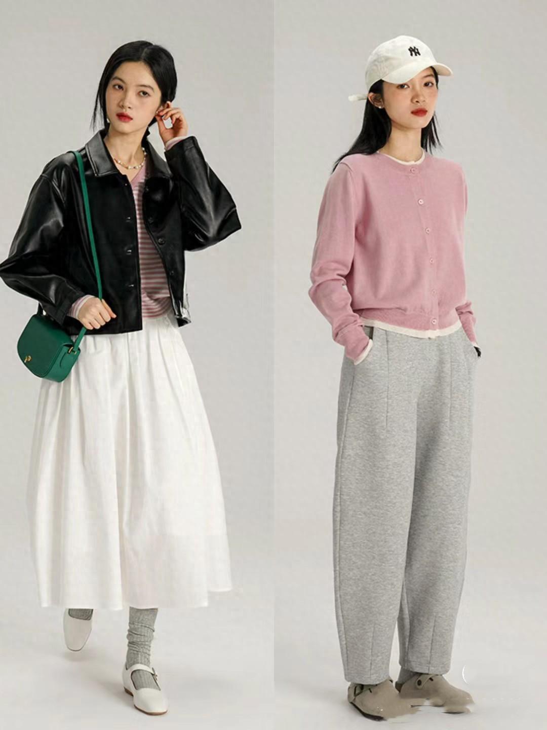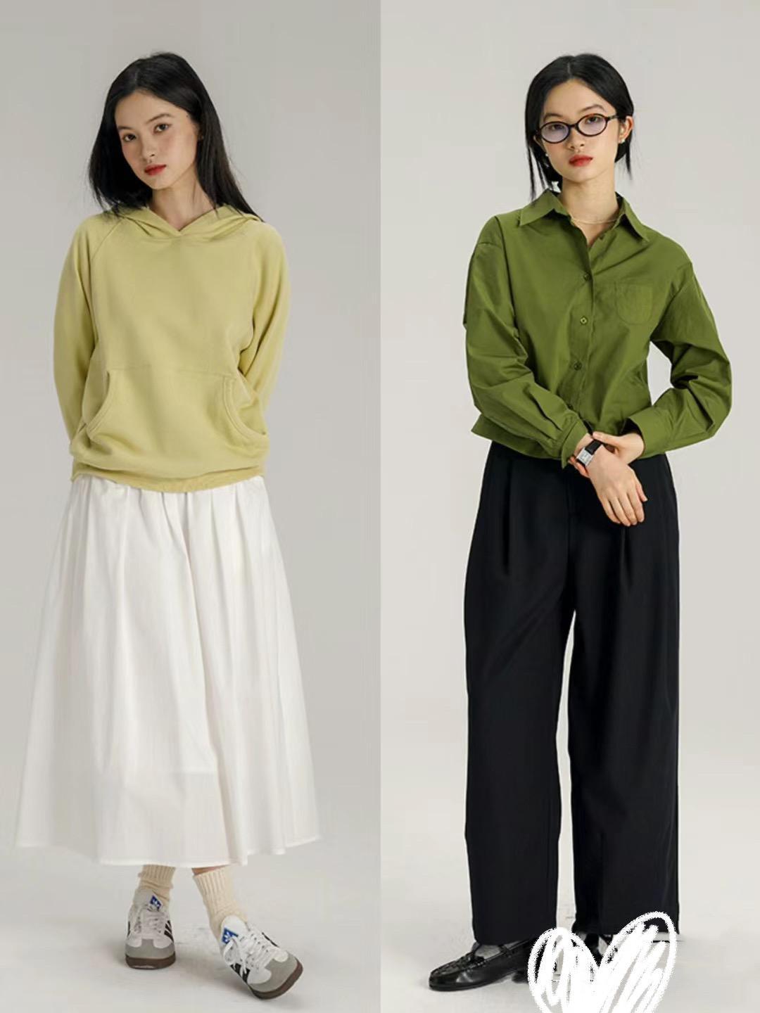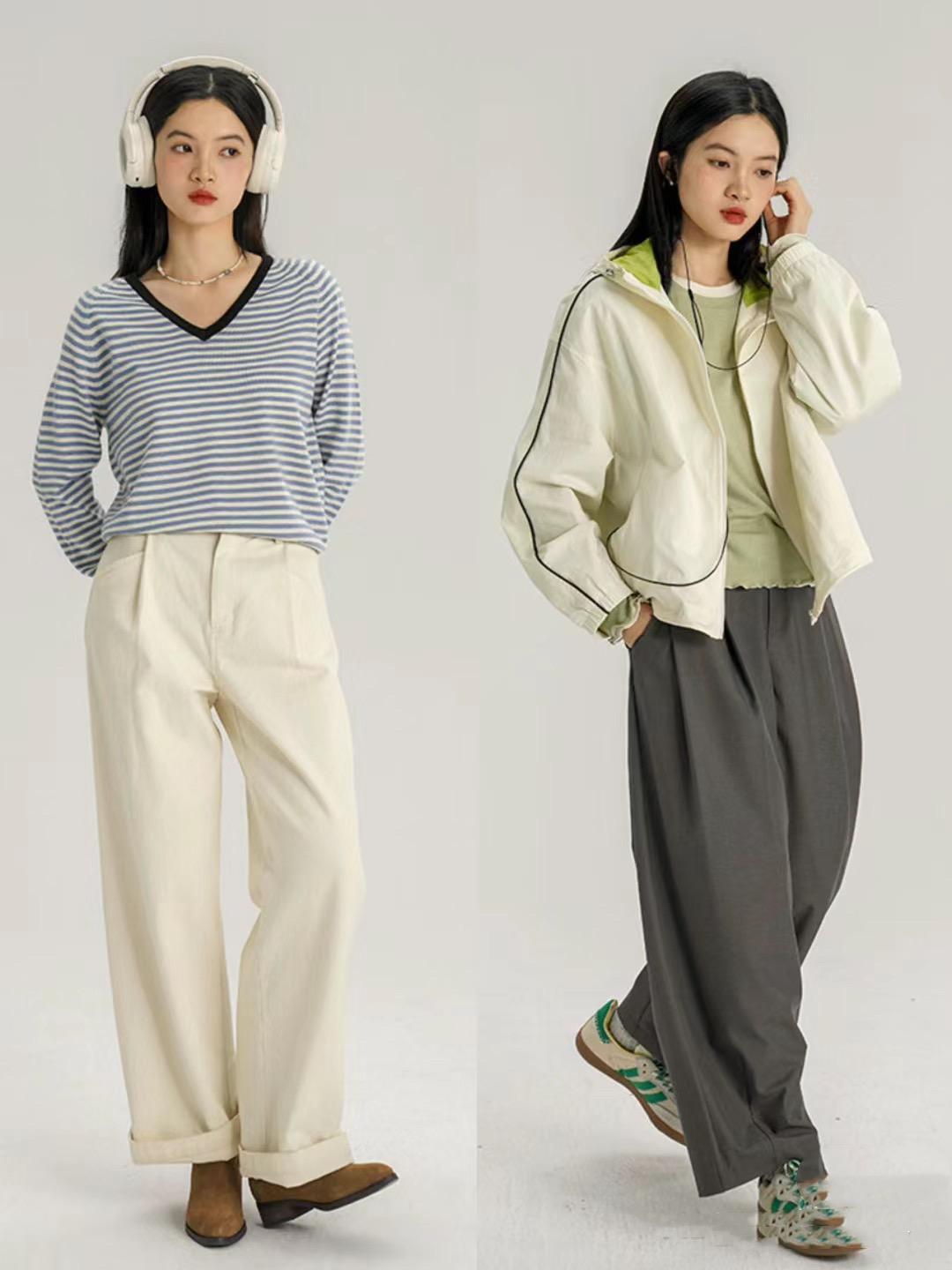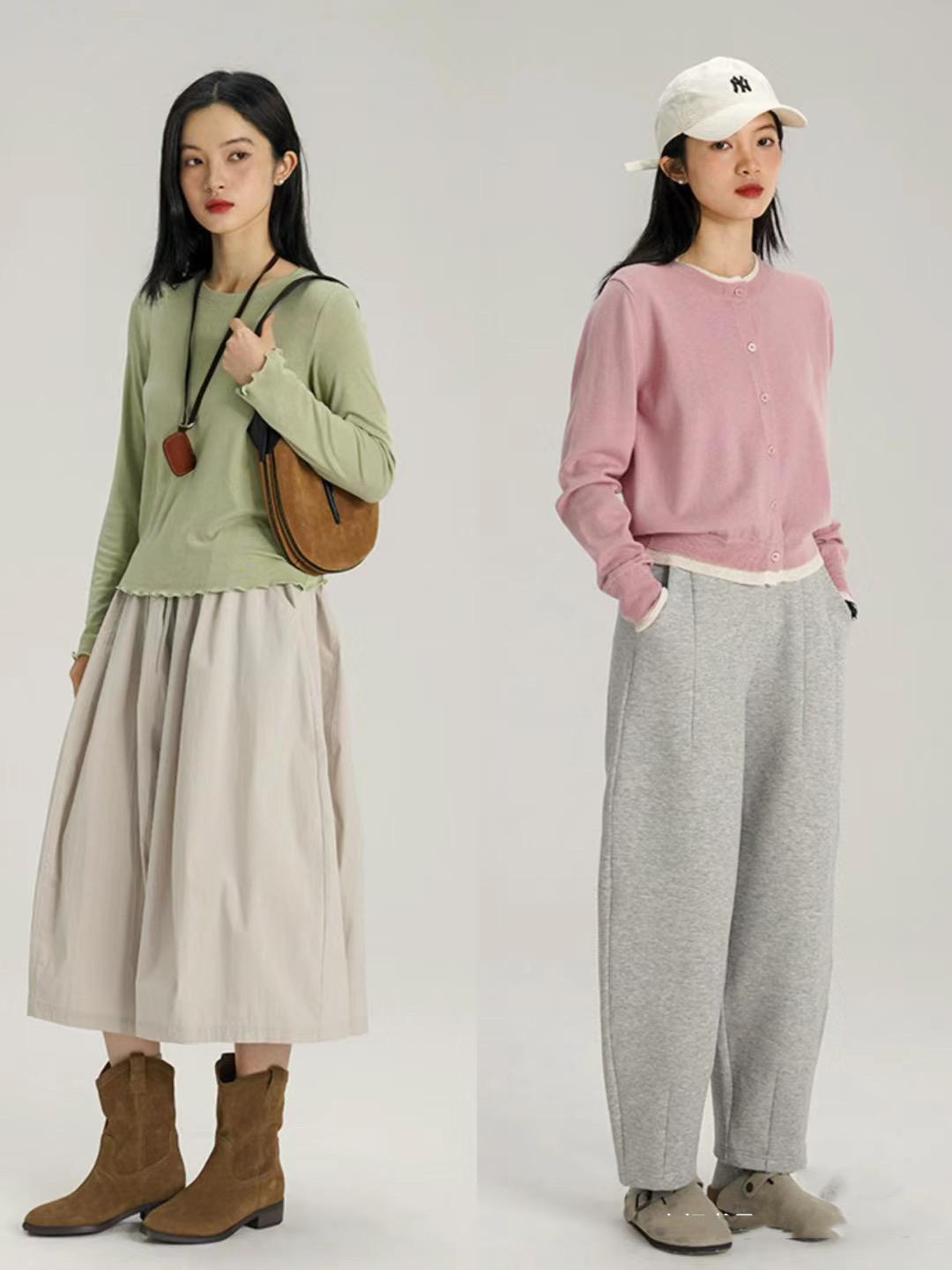 米白色的直筒褲、淺綠色的打底衫、杏白色的小外套,都屬於色彩淡雅柔和的款式。這些顏色亮度和飽和度都不高,穿起來溫婉低調、舒適又自然。