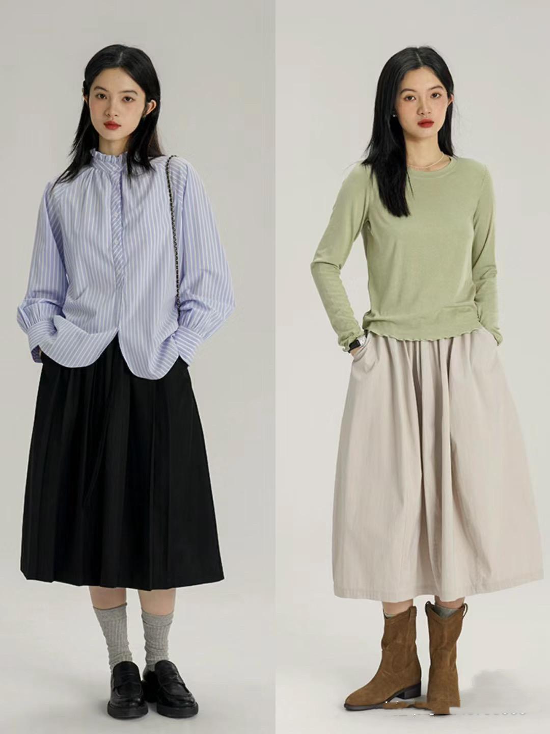 白色豎坑條的針織衫,可以搭配高腰黑色半身裙來穿着。黑色的高腰半身裙,選擇了立體的打褶設計,包容性更強、黑色半身裙露出腳踝和小腿線條,溫柔又輕盈。