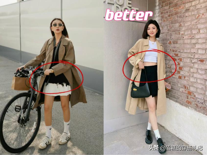 這裏的不要玩下衣失蹤,指的是不要再用“長內搭”去遮蓋短裙,我們強調的是風衣的長+裙子的短,如果是用下衣失蹤的額方式來搭配風衣,那麼整套穿搭很可能會變得俗氣和土氣,並且也會因爲沒有展現出層次感而不那麼顯高。