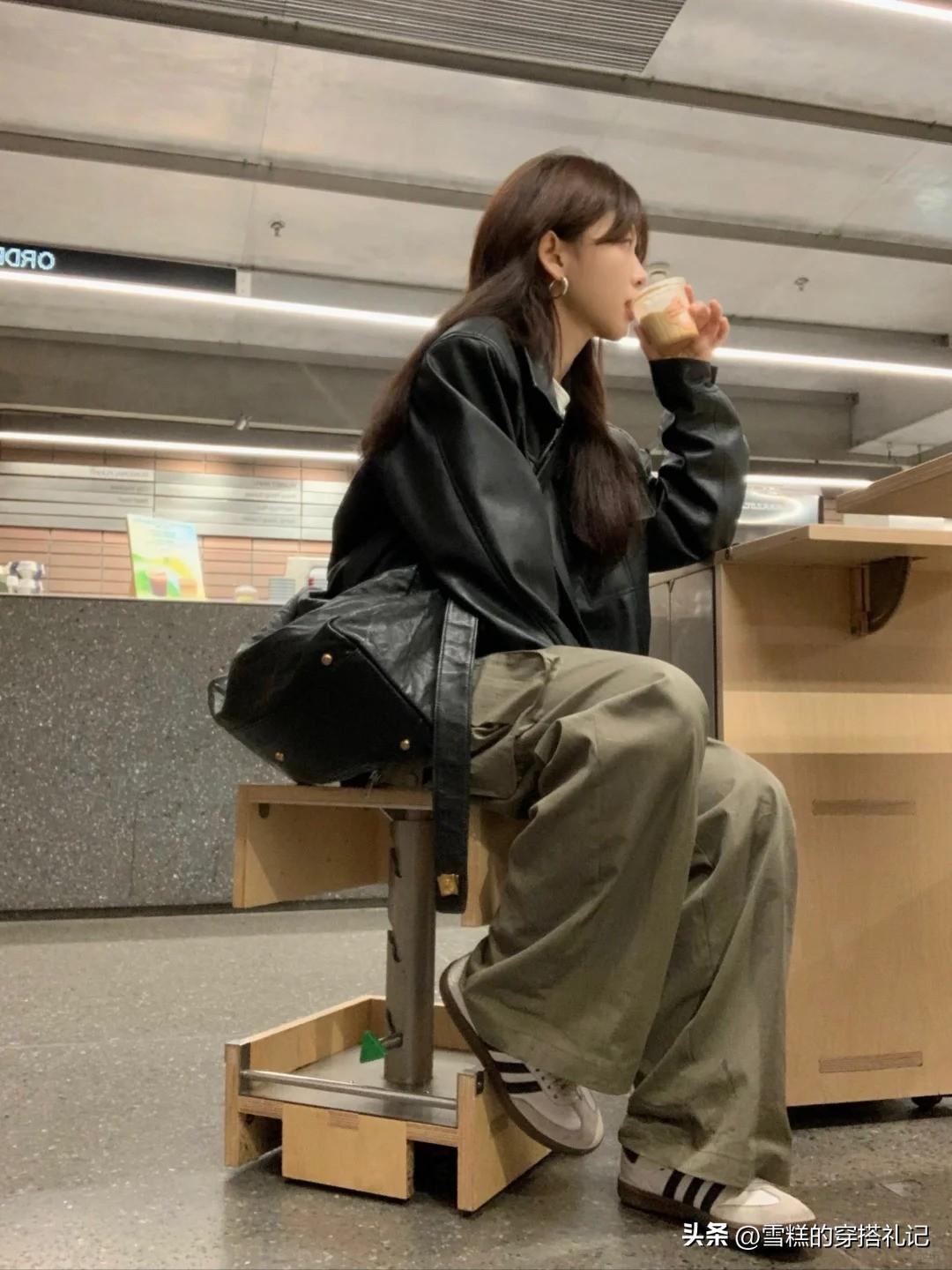 一件黑色的皮衣爲整體造型打下一個個利落帥氣的基調,下半身搭配一條咖色的休閒長褲,可以幫助提高中性氣質。