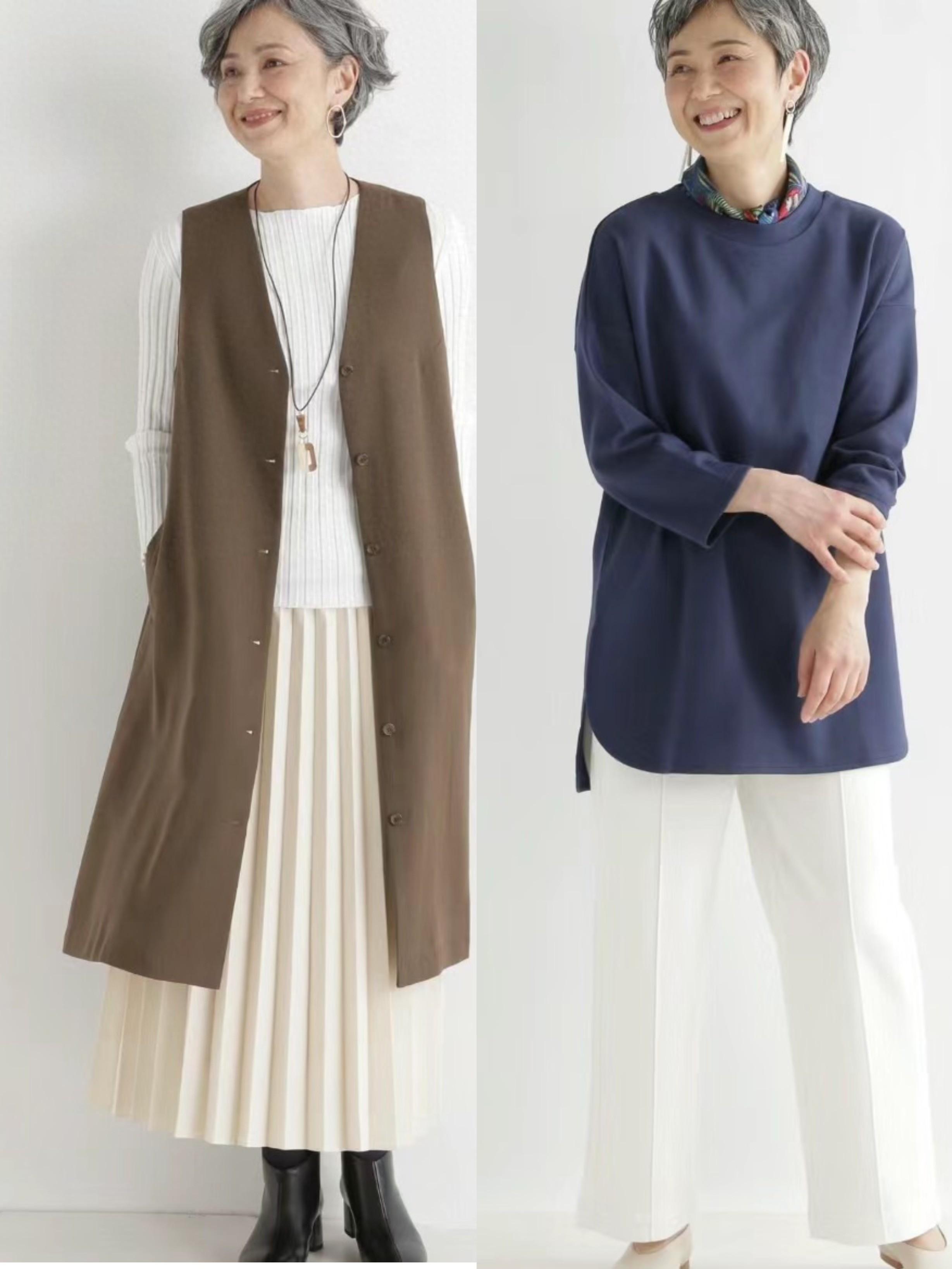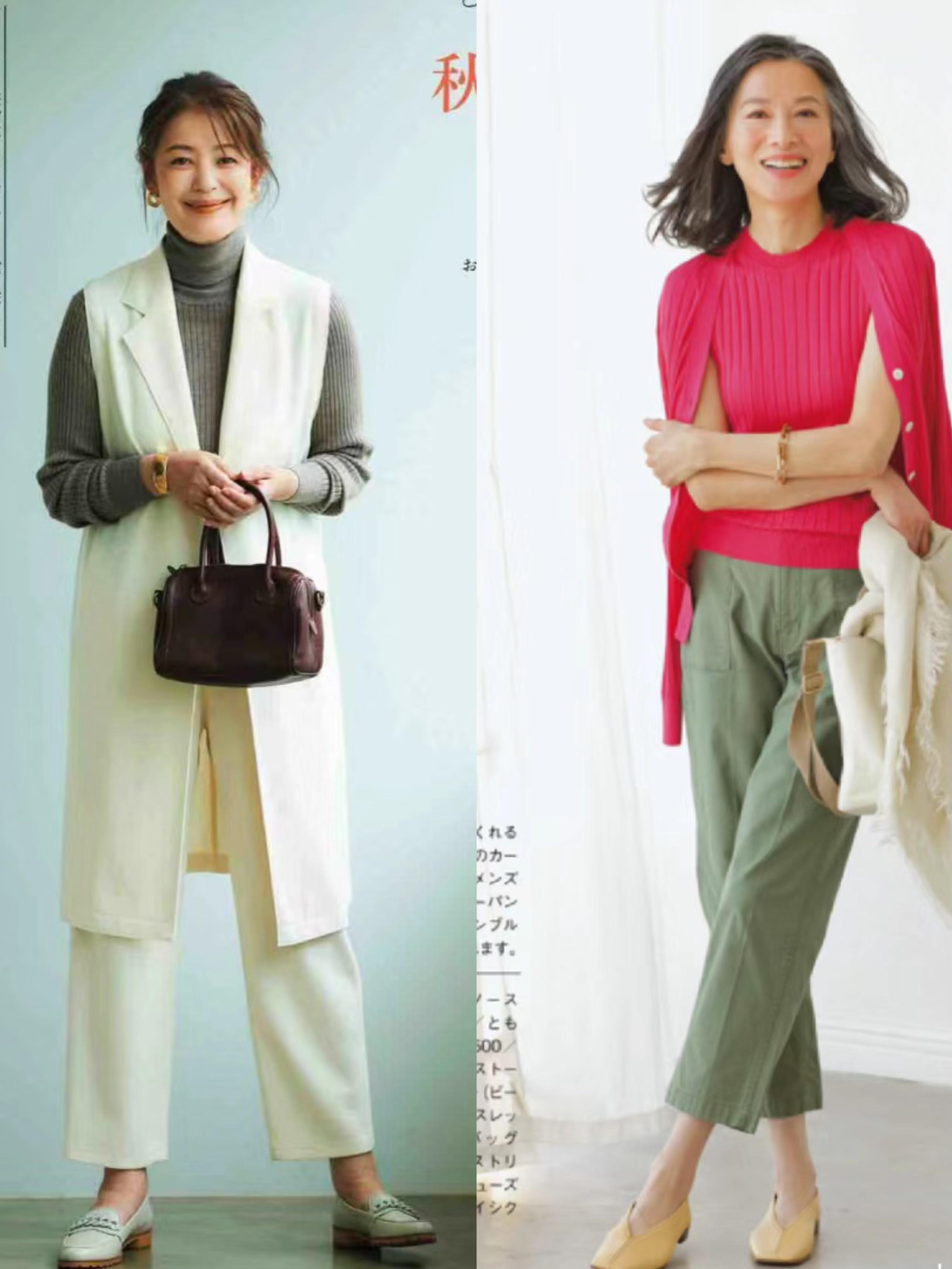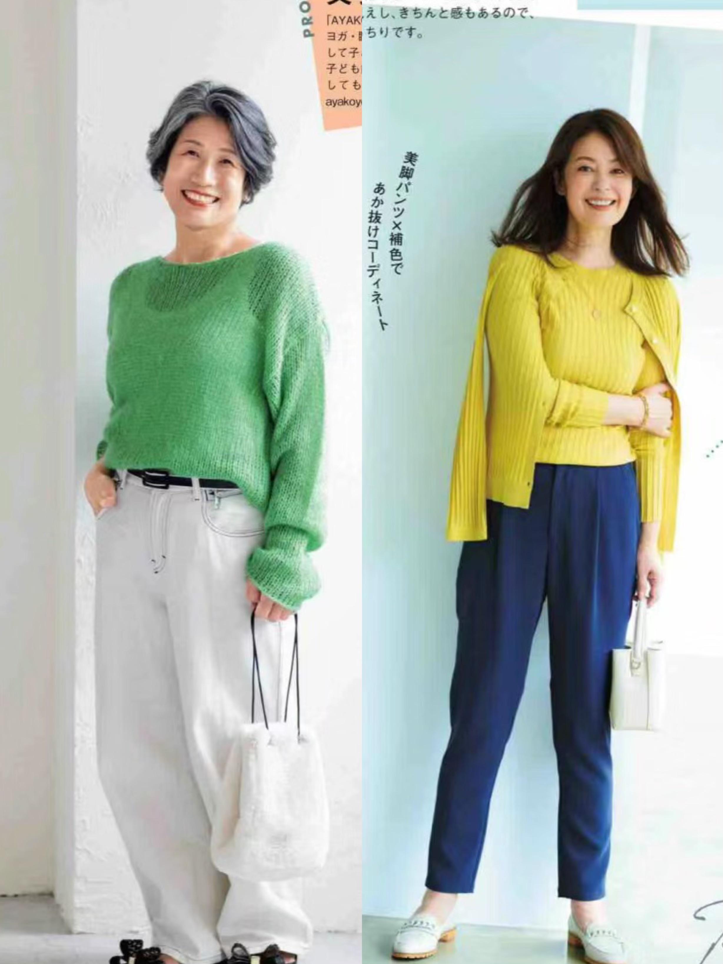 大齡女性,對於自己的容顏、其實沒有必要遮遮掩掩。大大方方的表現自己,即便是白了頭髮、也可以優雅得體。穿寬鬆的針織衫,配闊腿的直筒褲,簡單舒適又很體面。