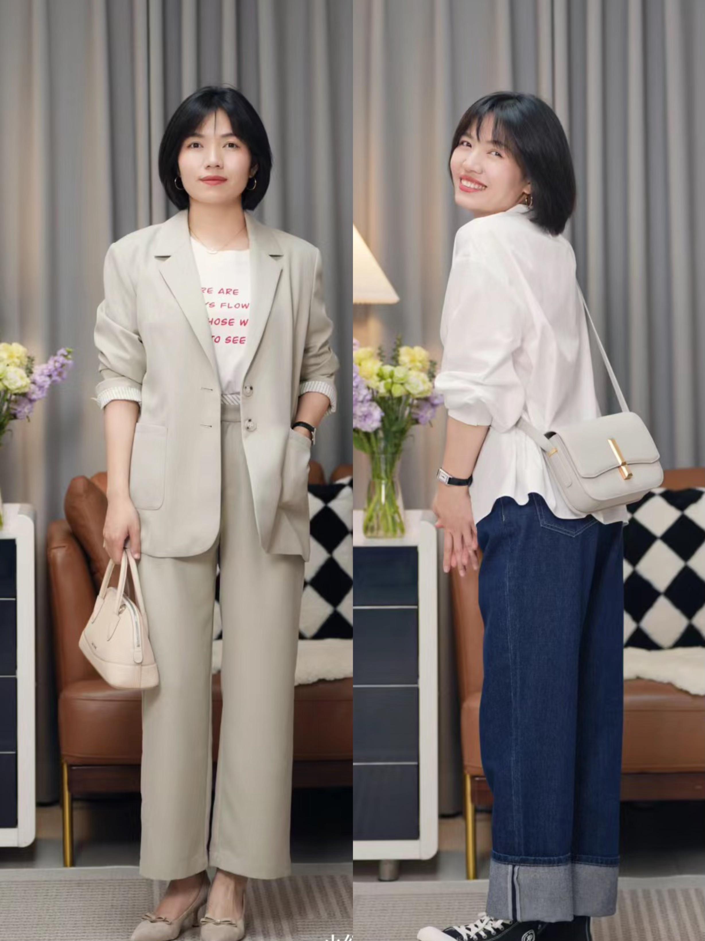 比如寬鬆的米白色西服外套,搭配同款的西裝褲就高級大方。白色襯衫搭配直筒的牛仔褲,也更修飾腿型。卷邊的直筒牛仔褲,可以修飾下身的厚重,顯得雙腿更加挺拔。