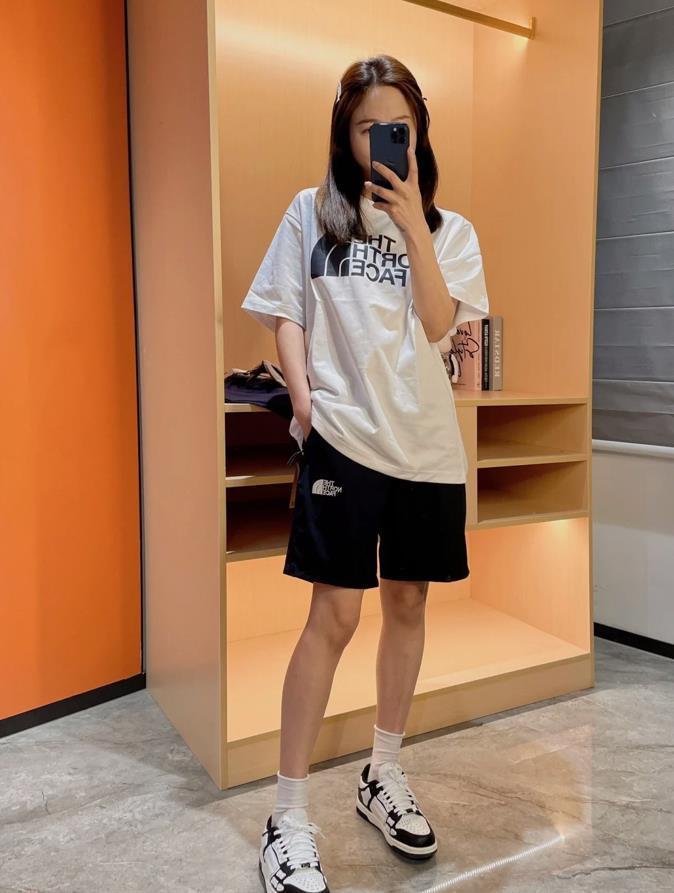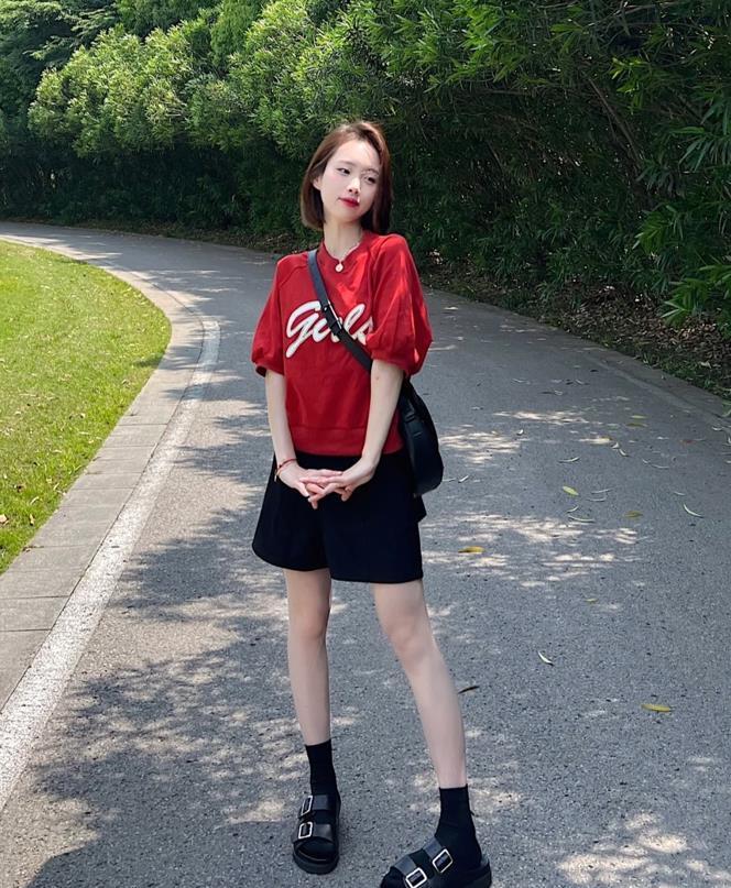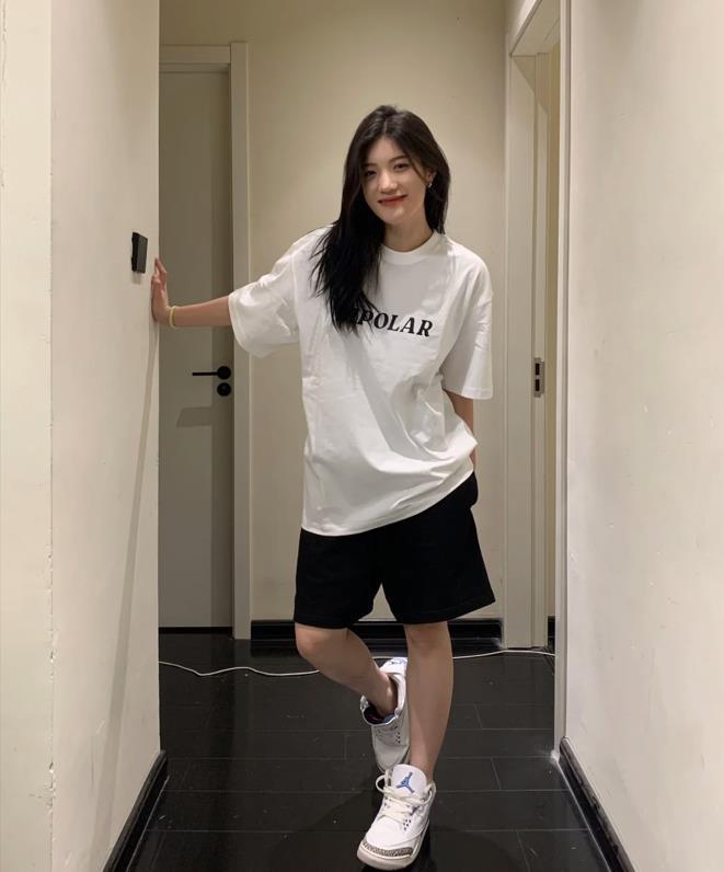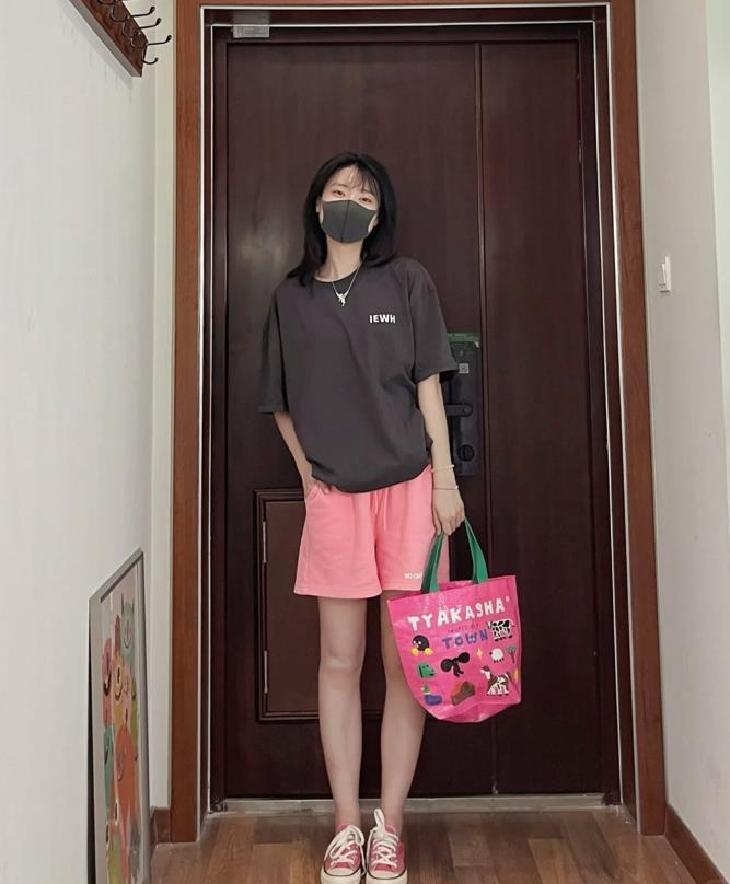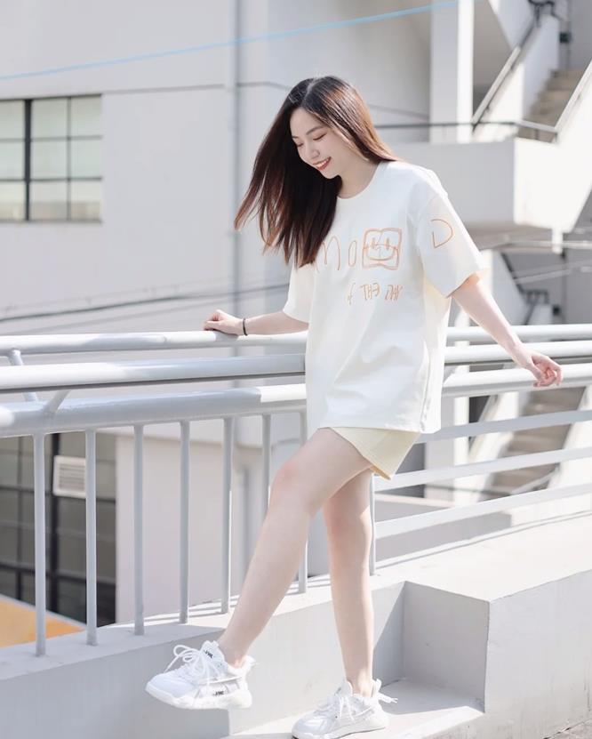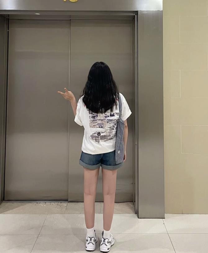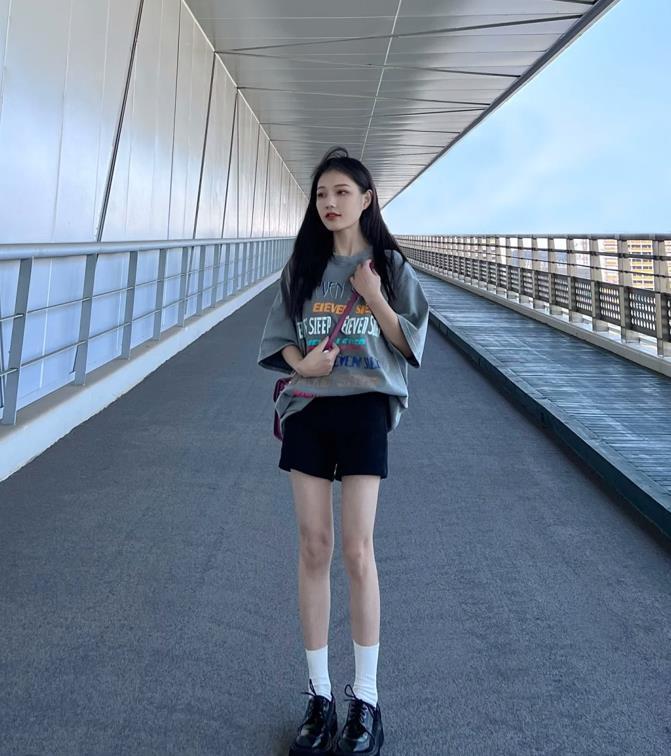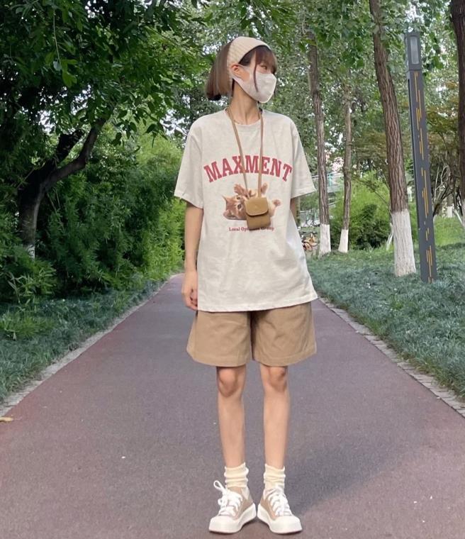 很適合150小個子女生的穿搭,可甜可酷的,夏天這樣穿真的好舒服啊,寬鬆的印花t恤,淺灰的配色,百搭經典又耐看。搭配黑色短褲,記得稍微把腰線提高起來一些,這樣就能巨顯腿長。