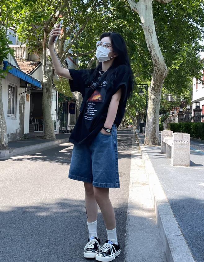 在搭配上,遵循一下鬆緊結合也是很有必要的,如果你選擇的是緊身的牛仔短褲,那麼可以配一件寬鬆的t恤。大腿粗的身材,則可以選擇寬鬆版型的牛仔短褲,輕鬆修飾腿部線條,又藏肉。