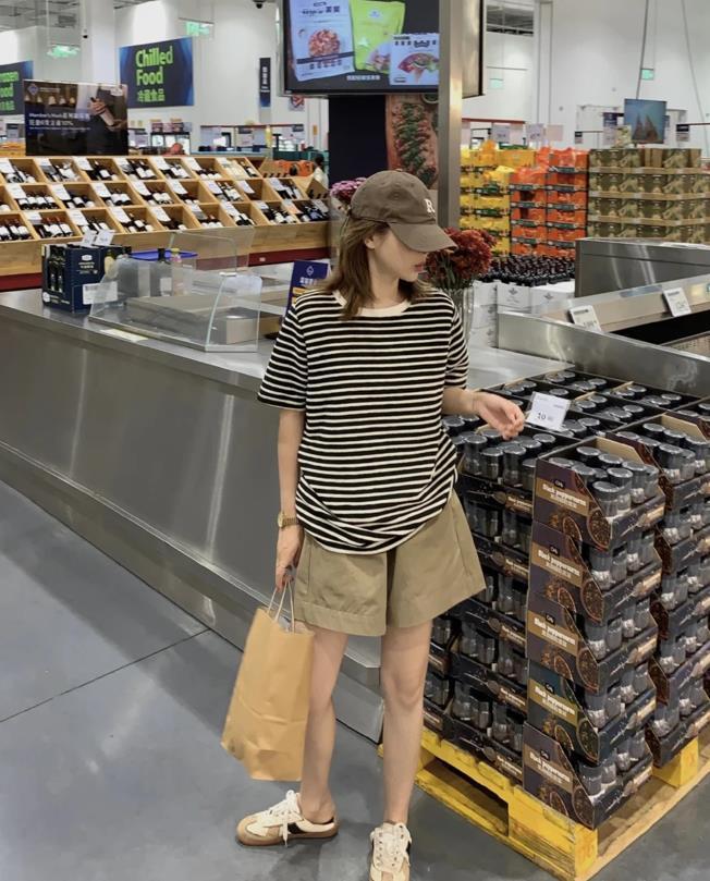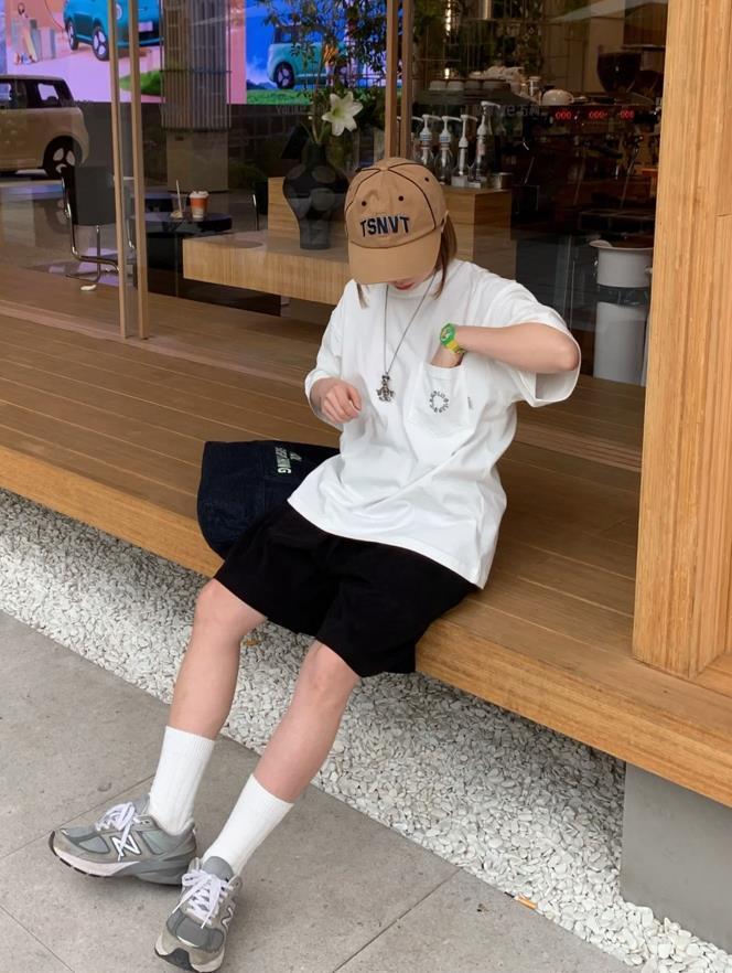 簡簡單單的大t恤配運動短褲,輕鬆自在又隨性,鞋子可配帆布鞋、運動鞋等。