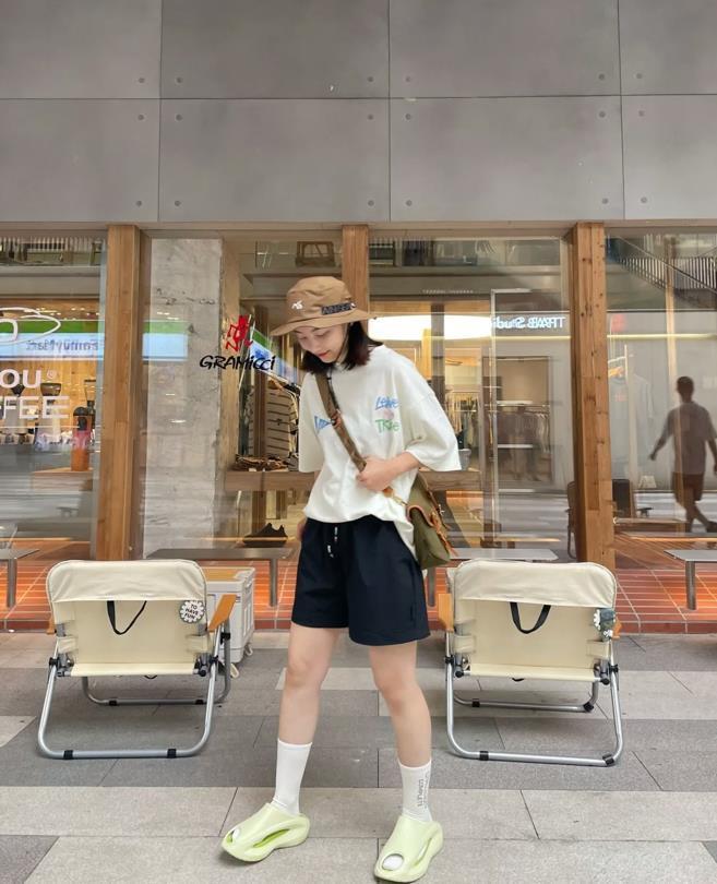 慵懶休閒風的穿搭,誰會不喜歡呢?悶熱的夏季出門,如果不想花費太多時間在搭配上面,又不想穿得太隨意,寬鬆t恤配運動短褲就可以,再加上一雙個性的拖鞋就搞定了。