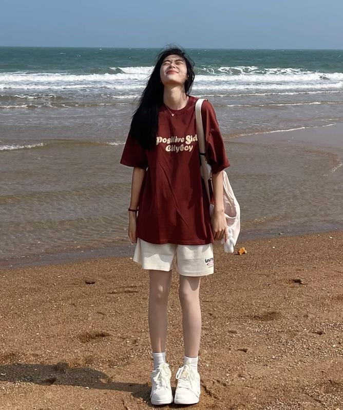 趁着假期,約上好友一起去海邊遊玩吧,短褲+t恤的穿法再合適不過,紅棕色短袖t恤,下身是一條米色休閒短褲,夏天這樣穿好舒服。褲子的版型是寬鬆的,就算是大腿粗的身材也不怕。